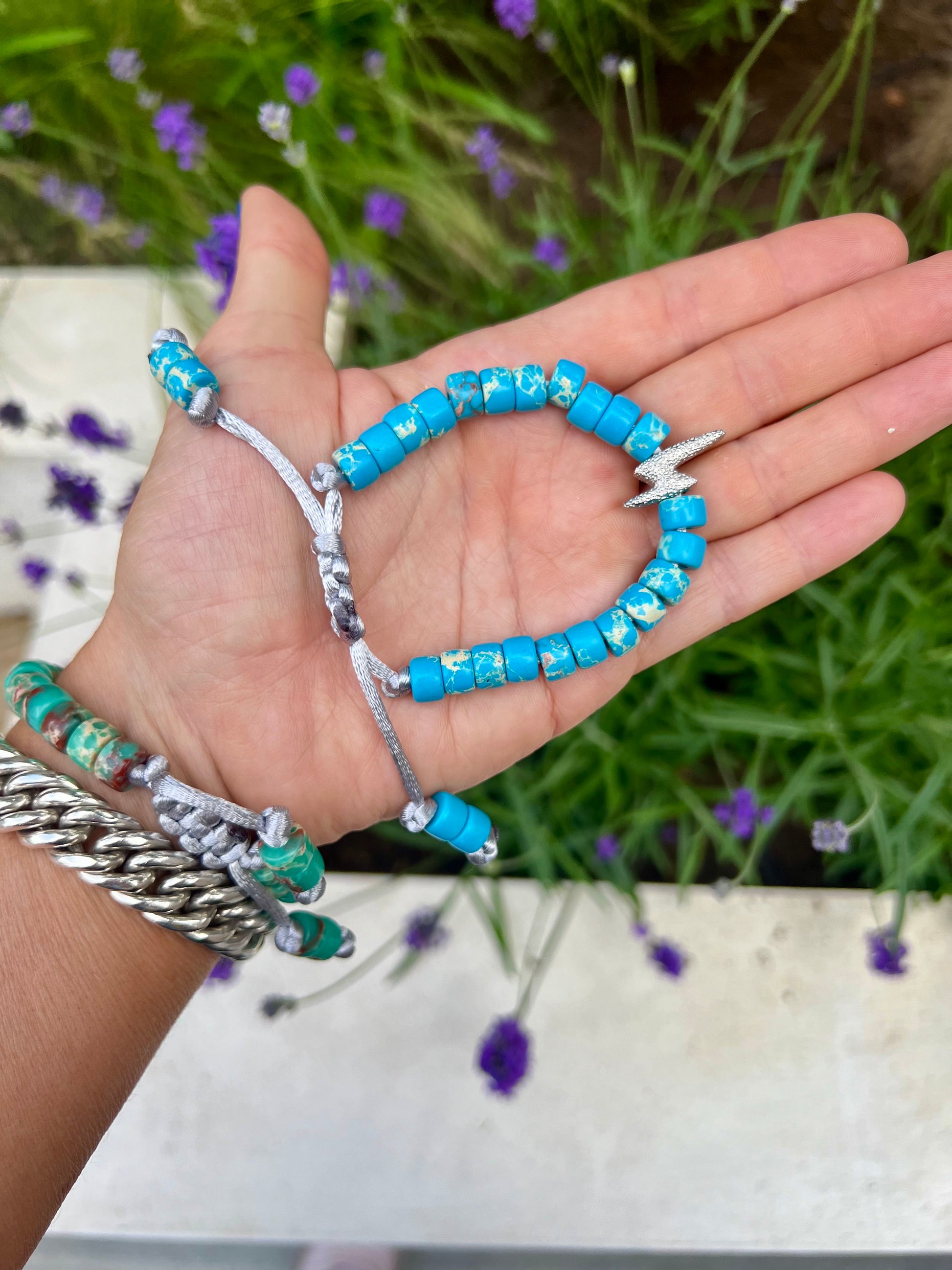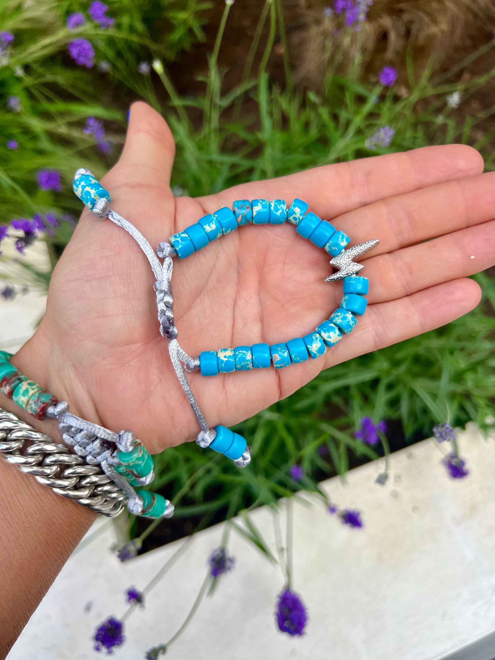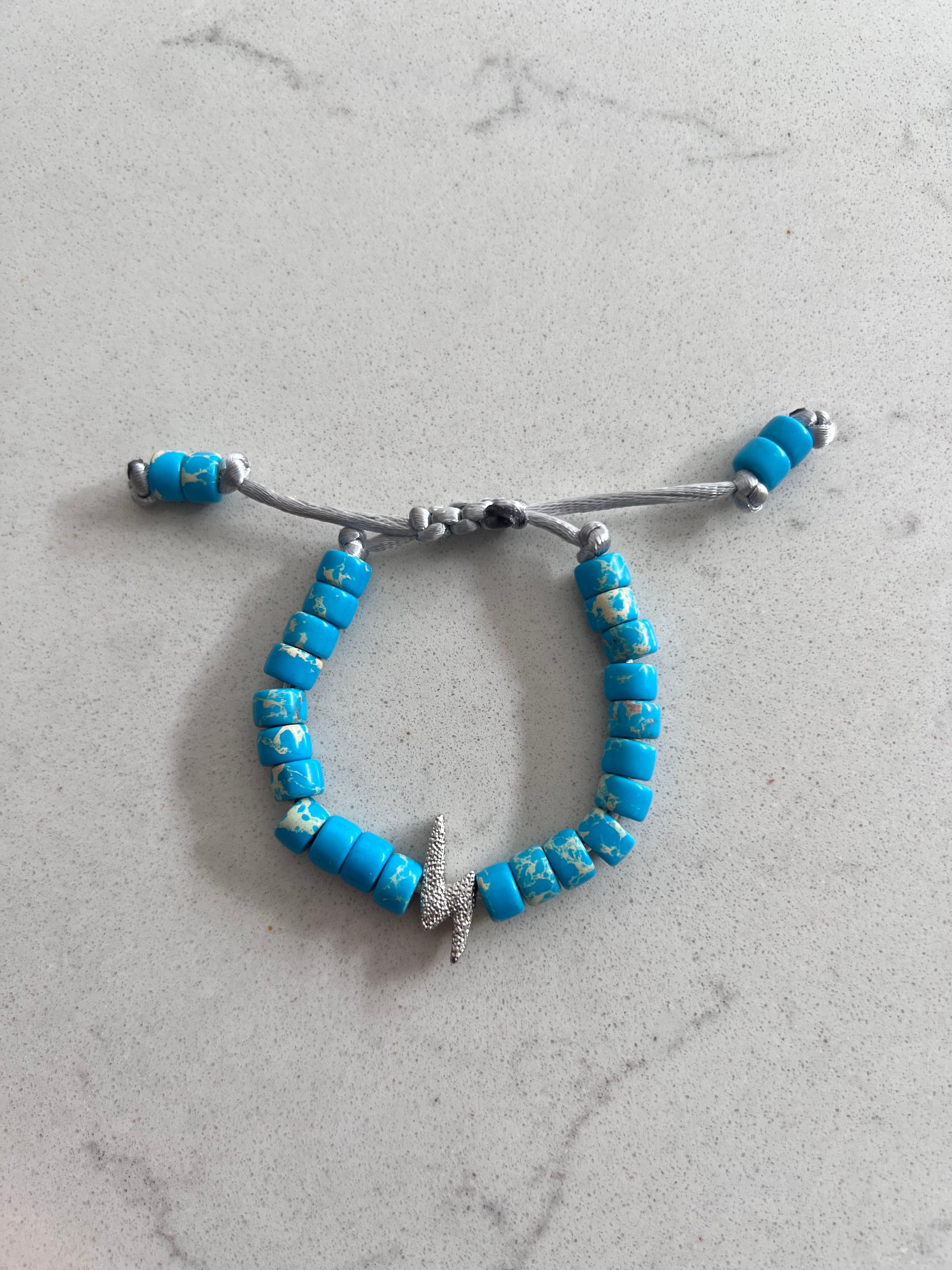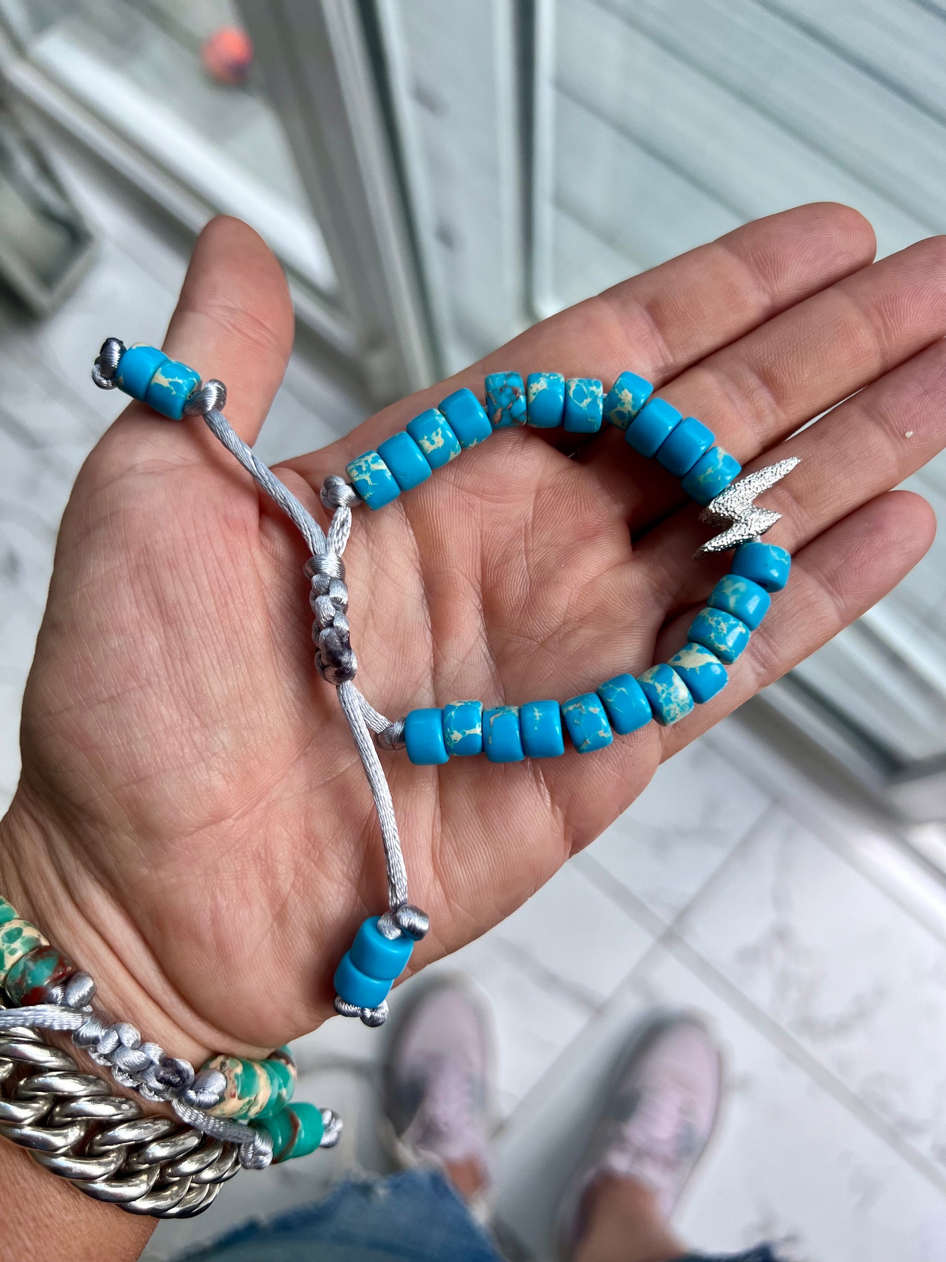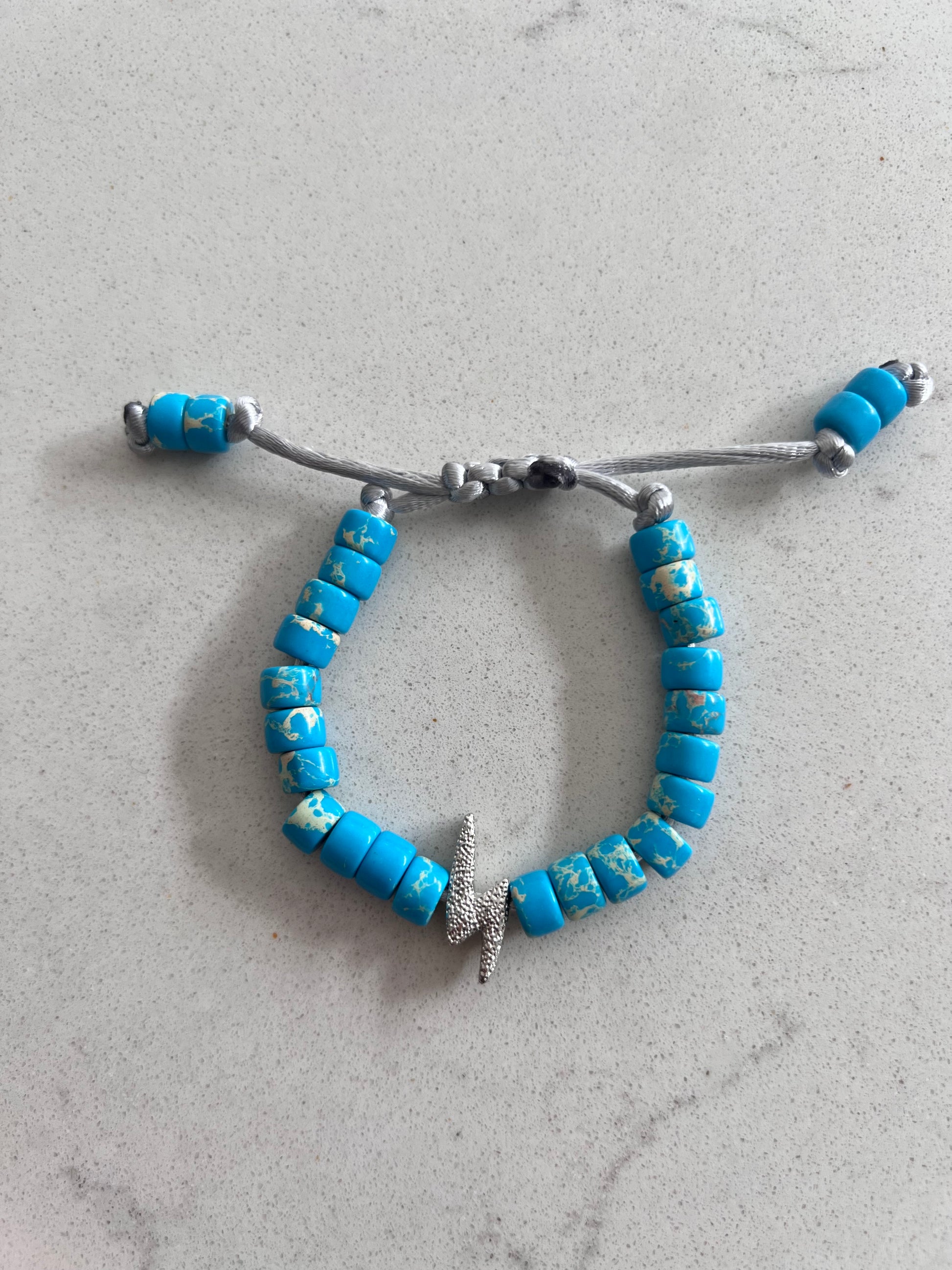 Made from Blue Imperial Jasper Gemstone Beads and a Silver Textured Bolt Bead.