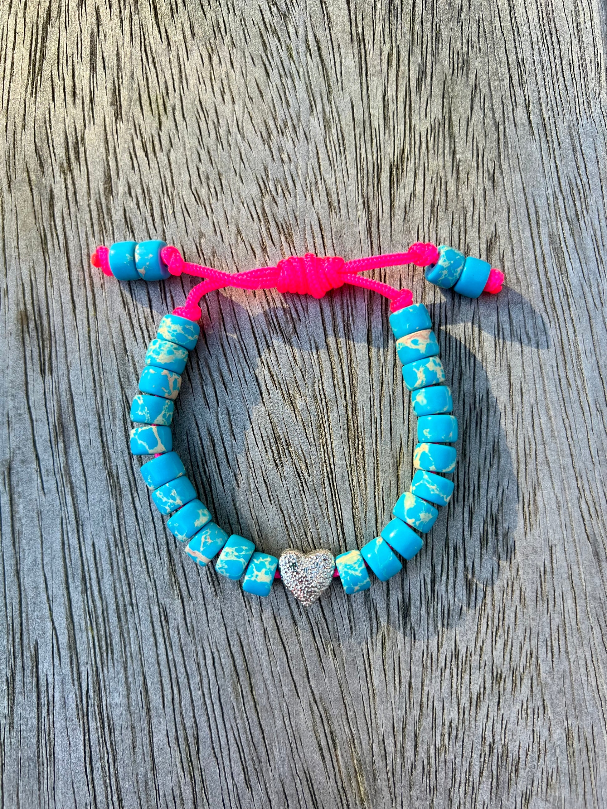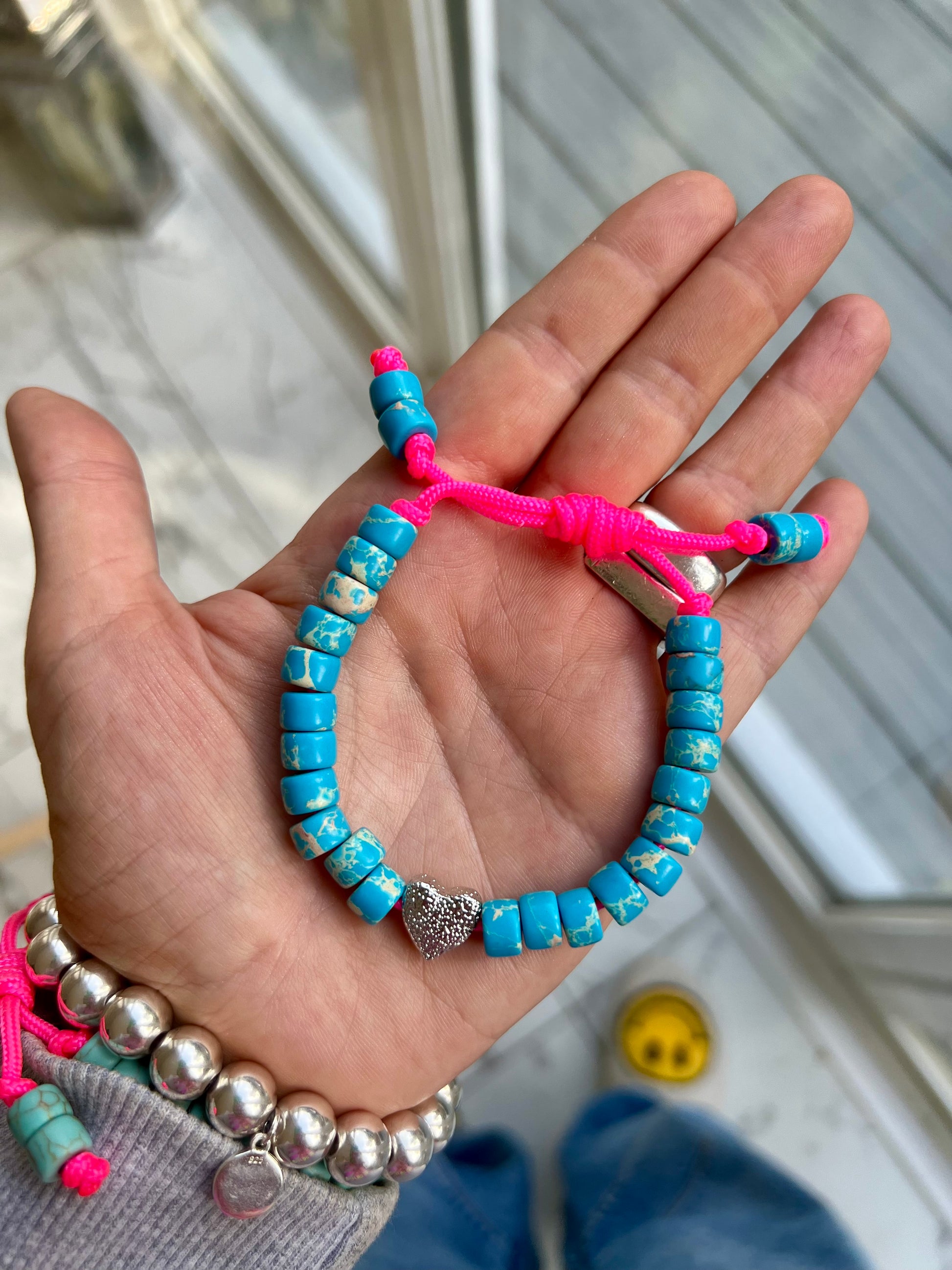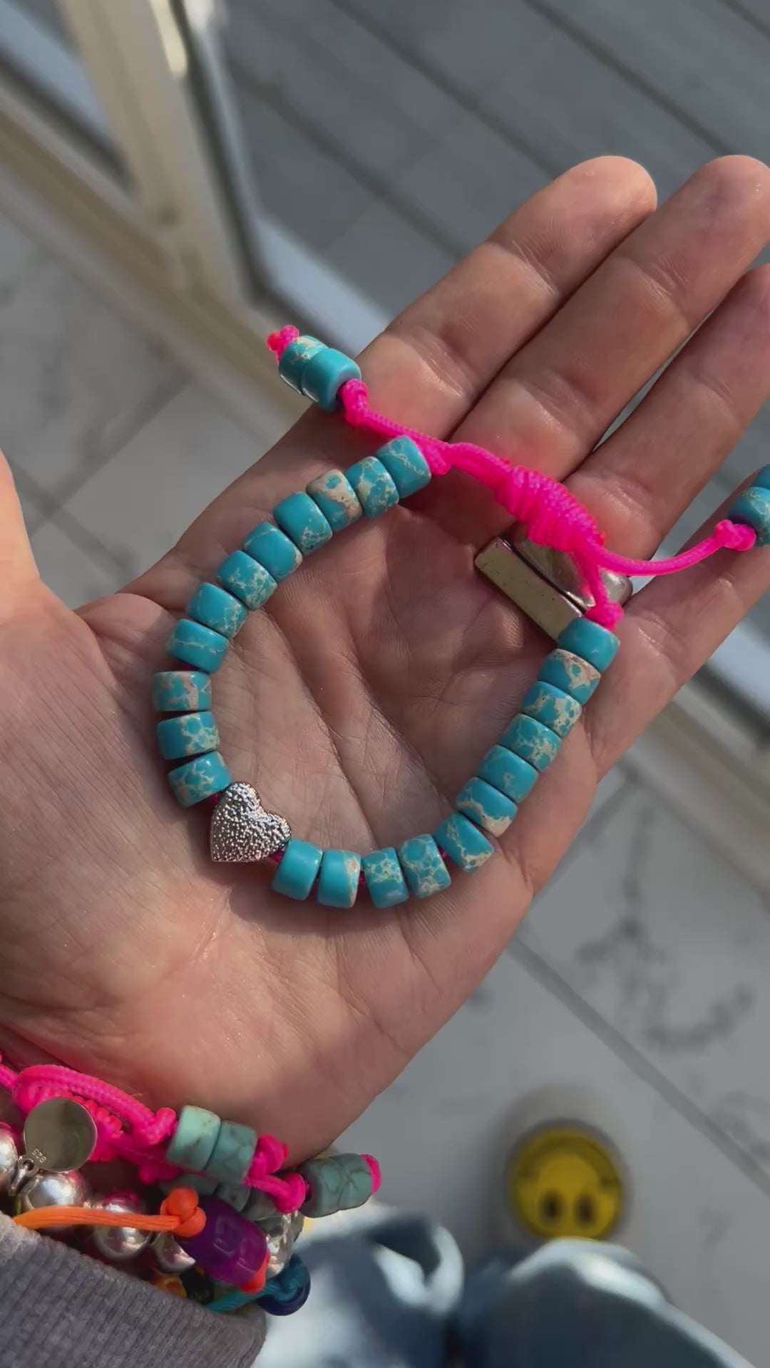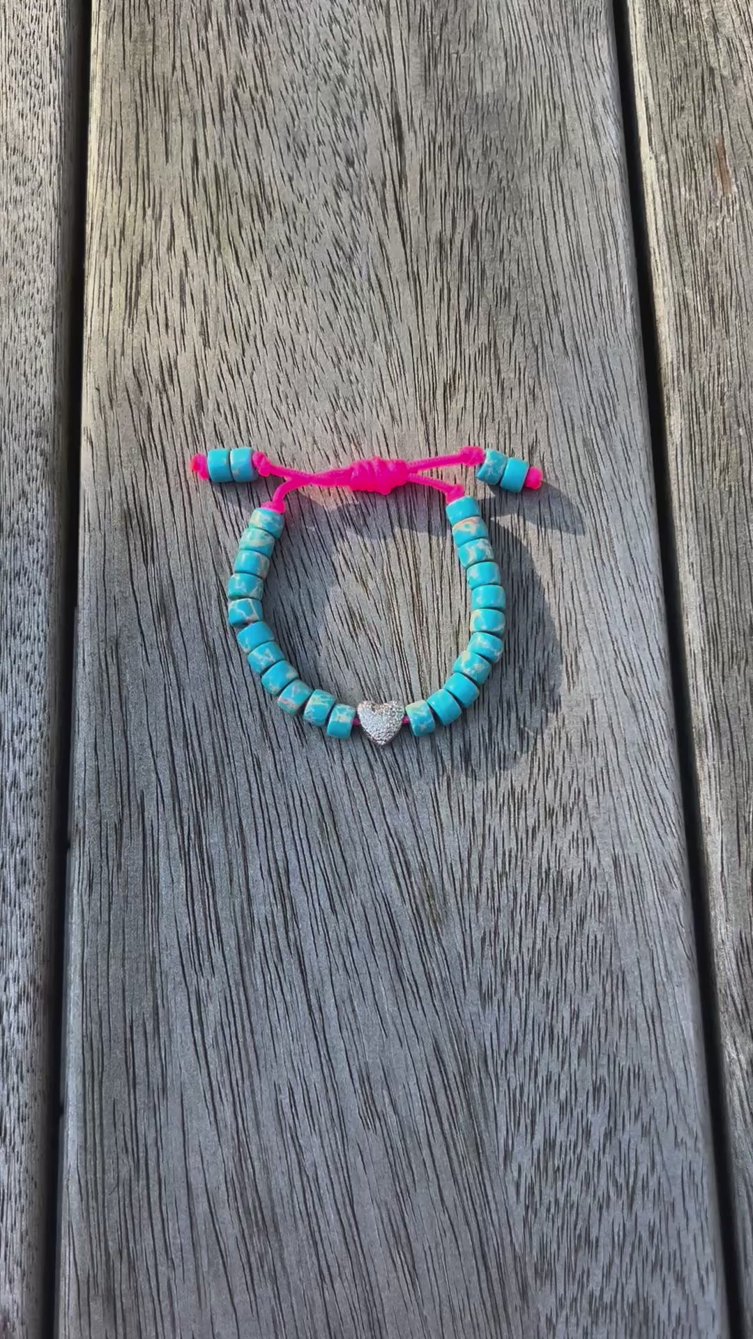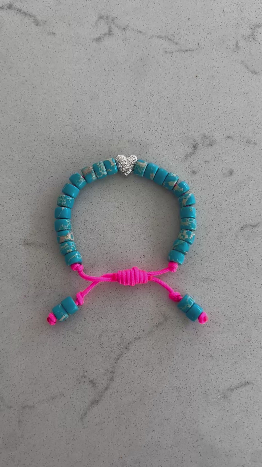 Beaded onto a neon pink nylon cord and finished with a twisted sliding knot making it adjustable to you wrist 🤜🏻