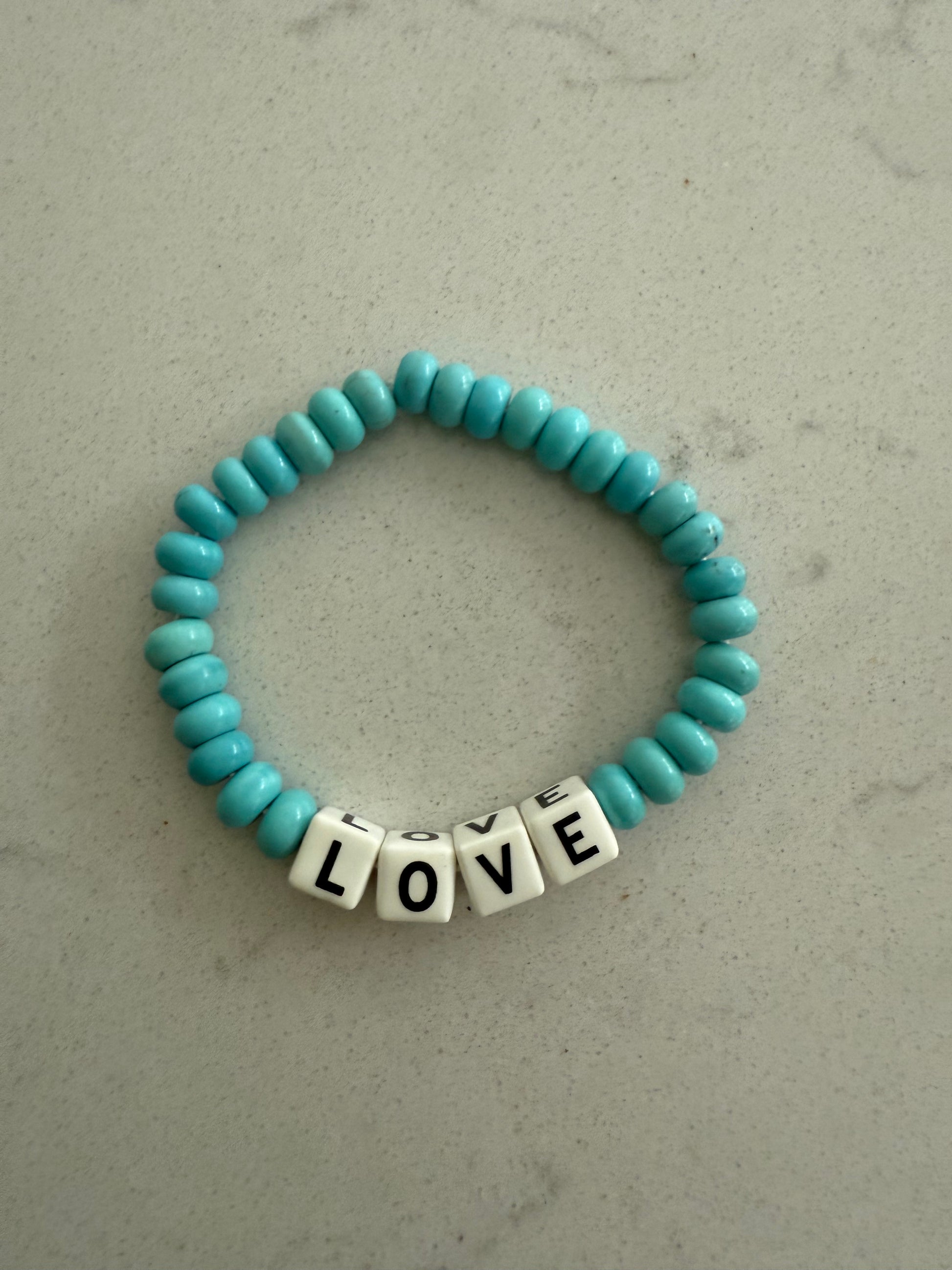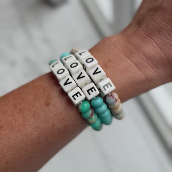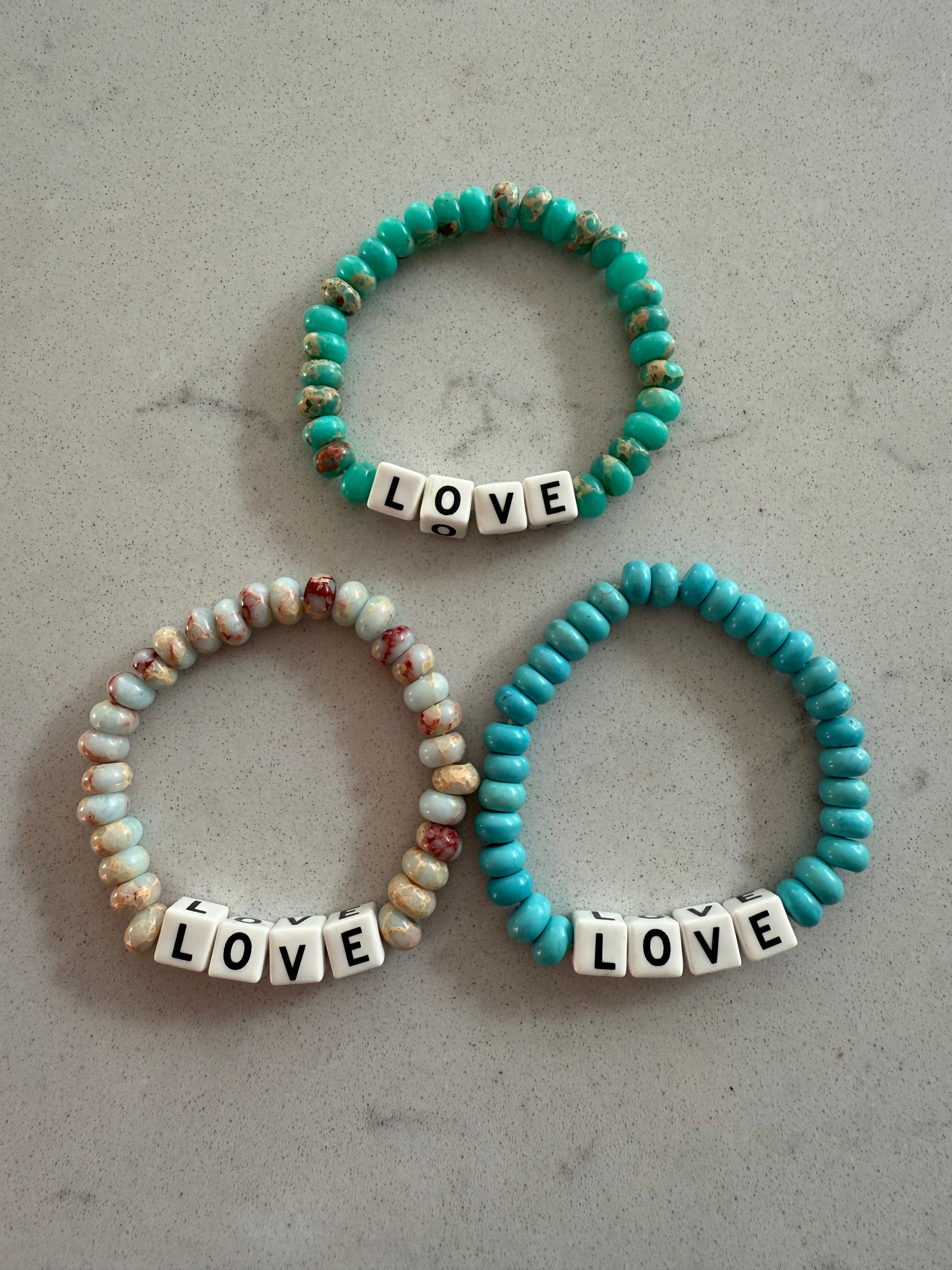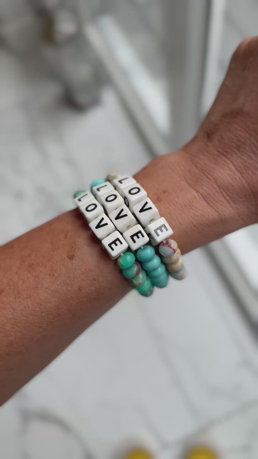 Each bracelet is handmade with natural gemstones and ceramic letter beads that spell LOVE — because kindness never goes out of style.