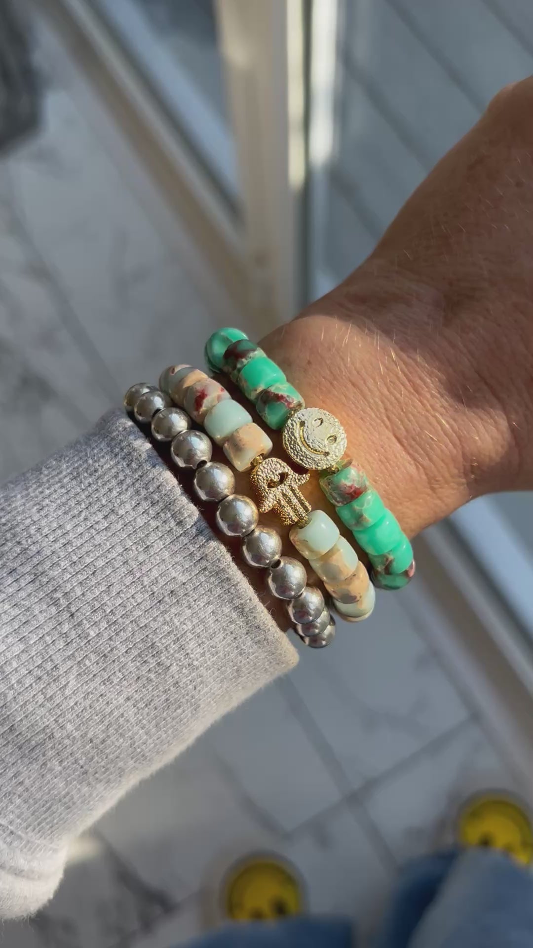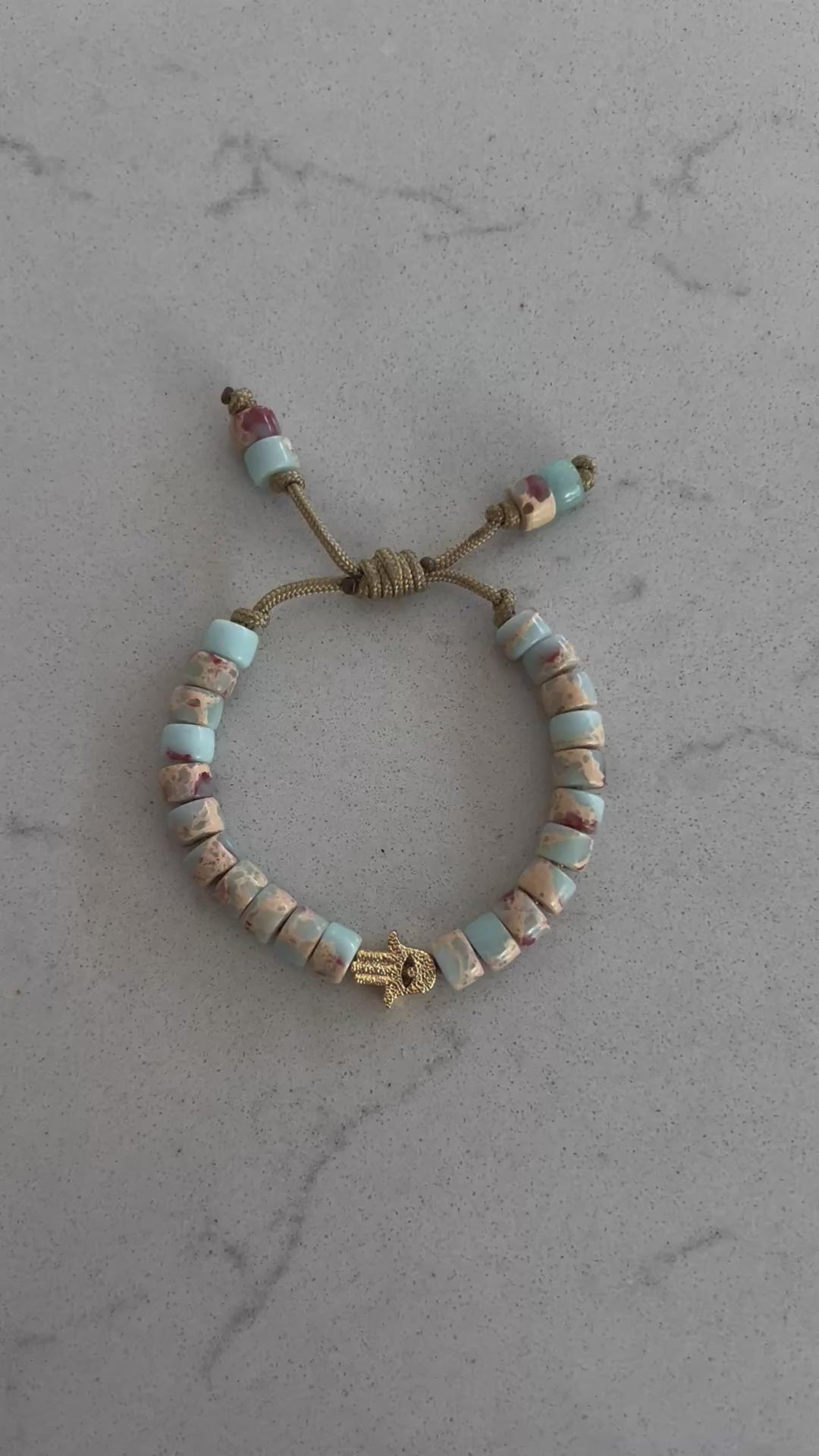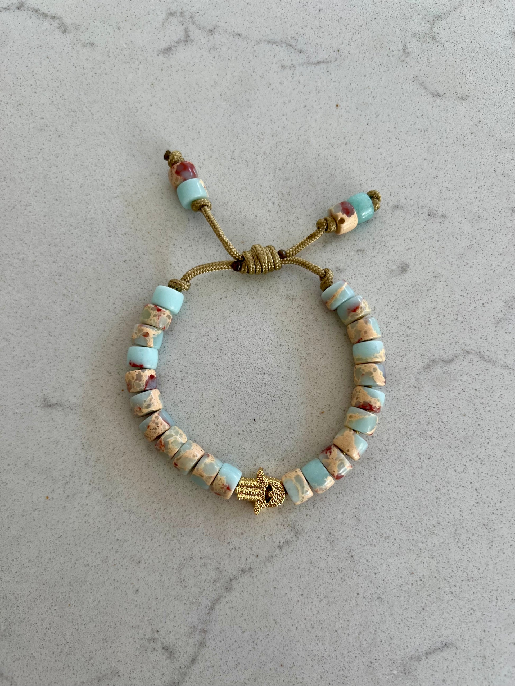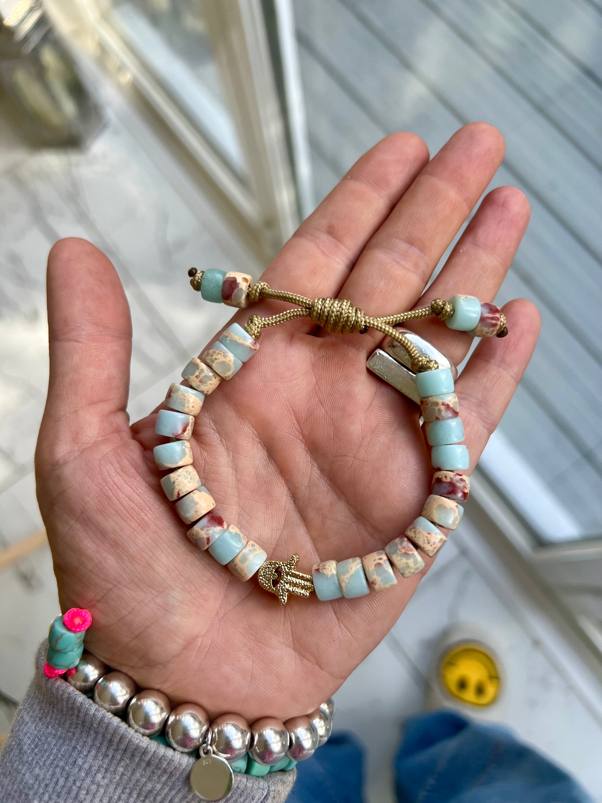 Made from Blue Imperial Jasper Gemstone Beads, with a Gold Textured Hamsa Bead taking centre stage 💖