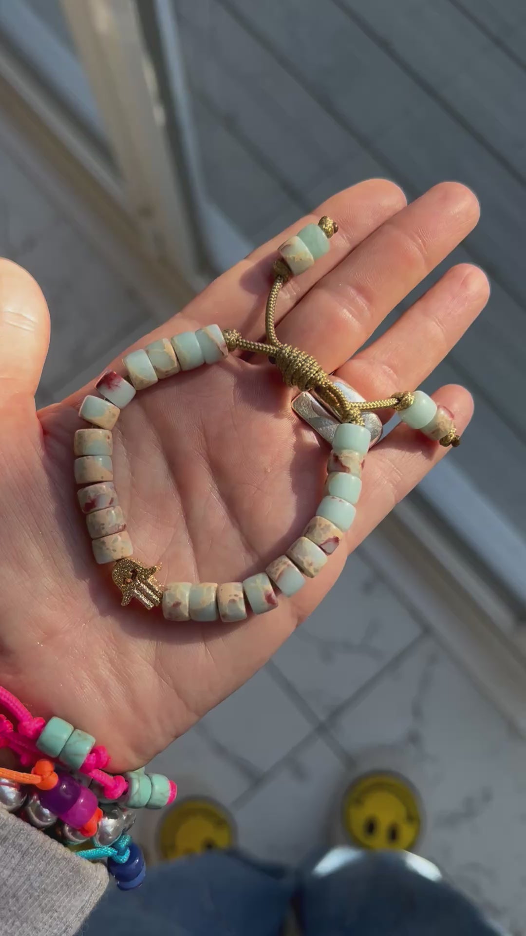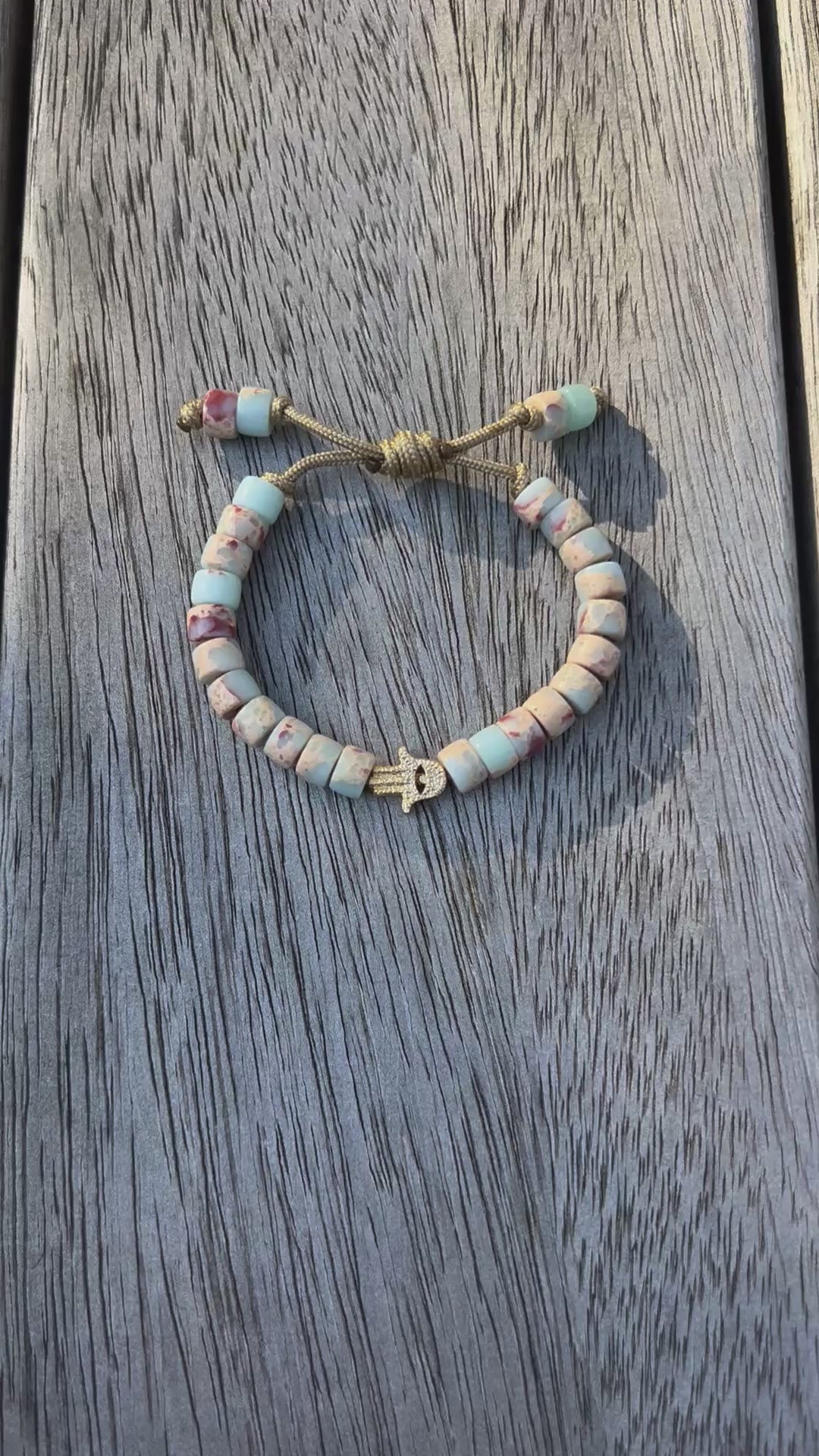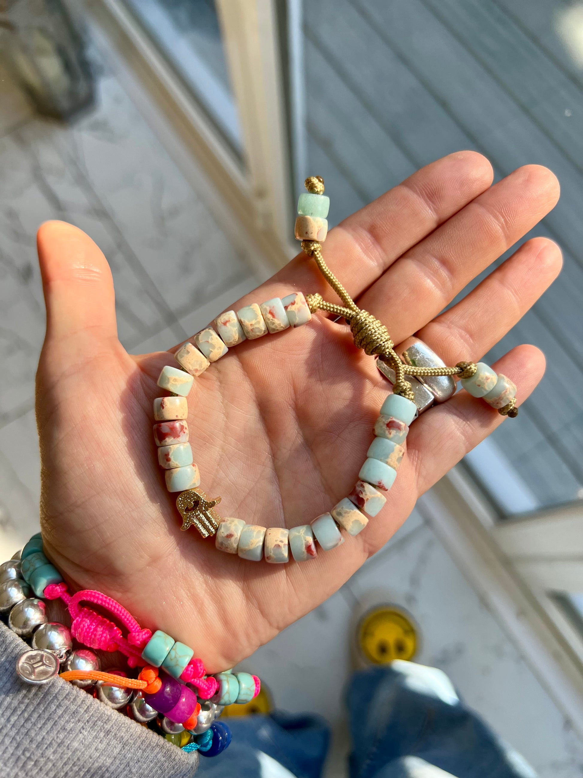 Beaded onto a gold nylon cord and finished with a twisted sliding knot making it adjustable to you wrist 🤜🏻