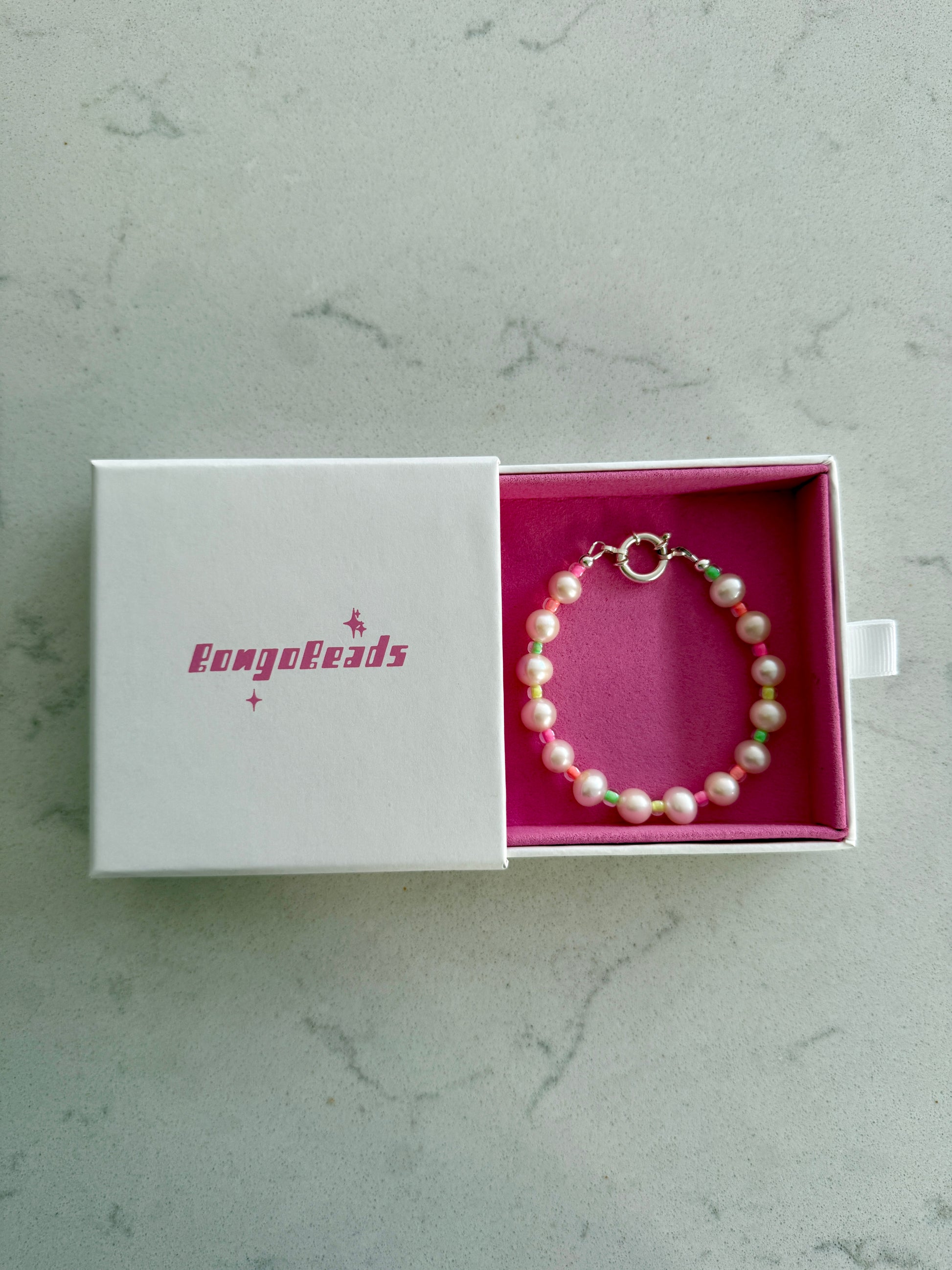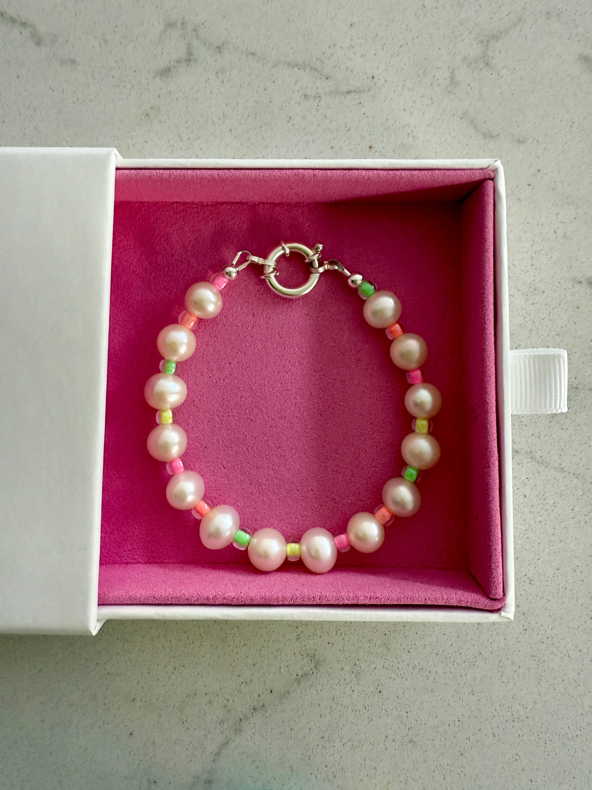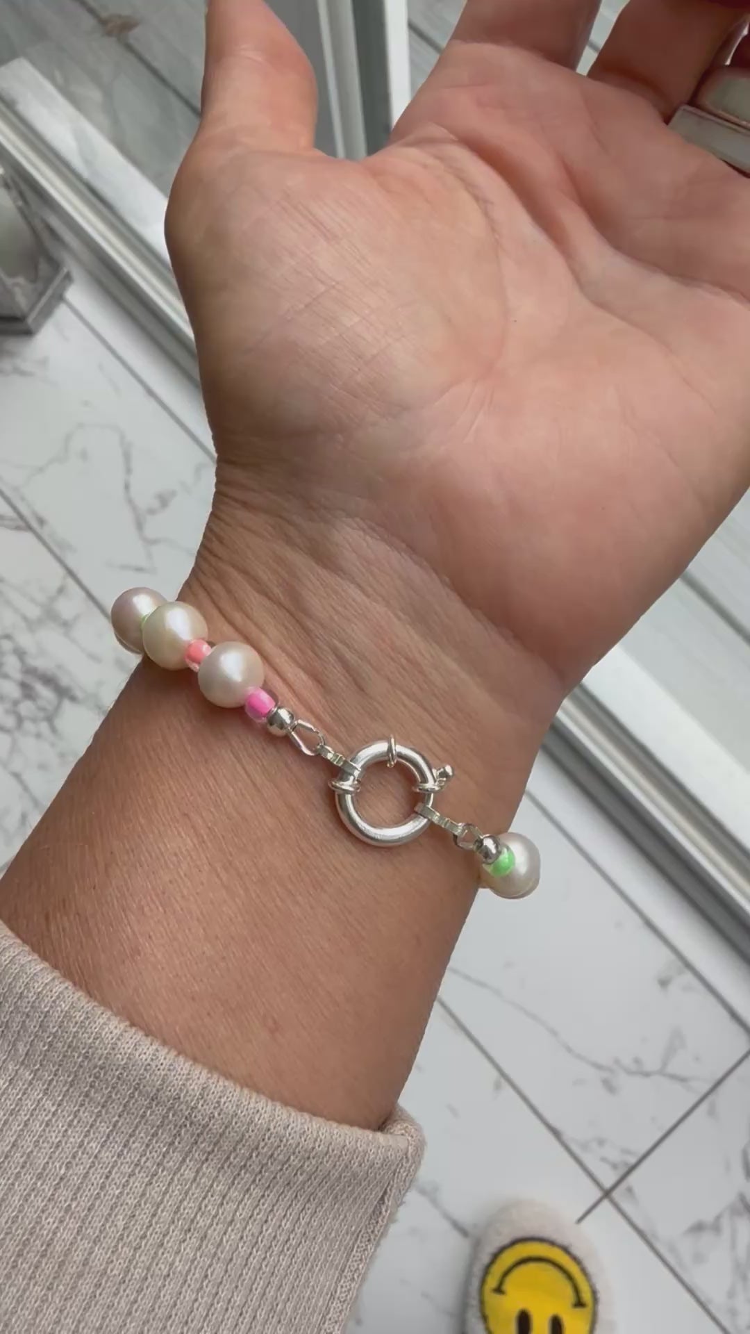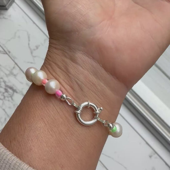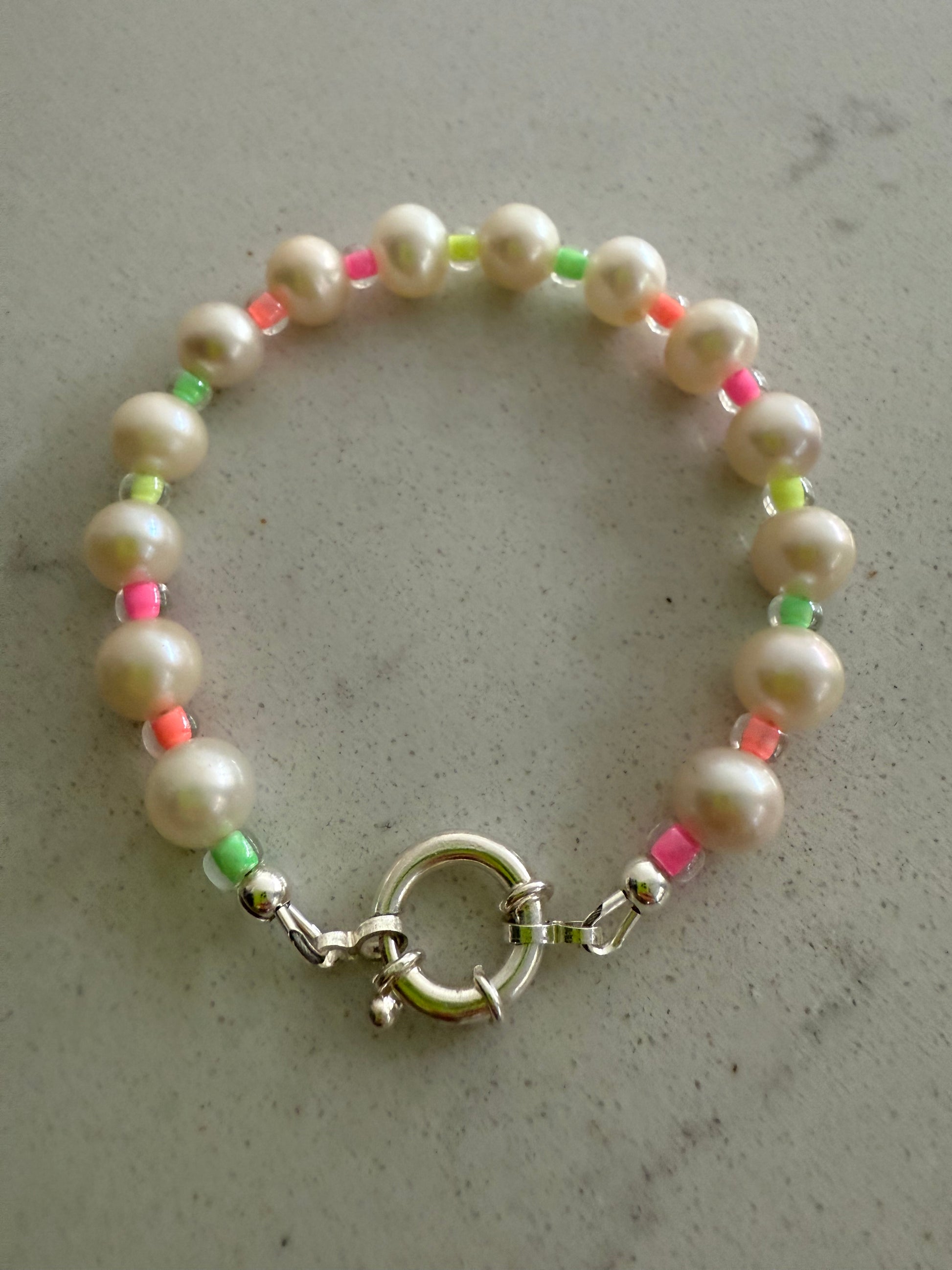 Made from stunning round freshwater pearls with neon Miyuki beads between the pearls to give it a traditional bracelet , a modern twist! ๐