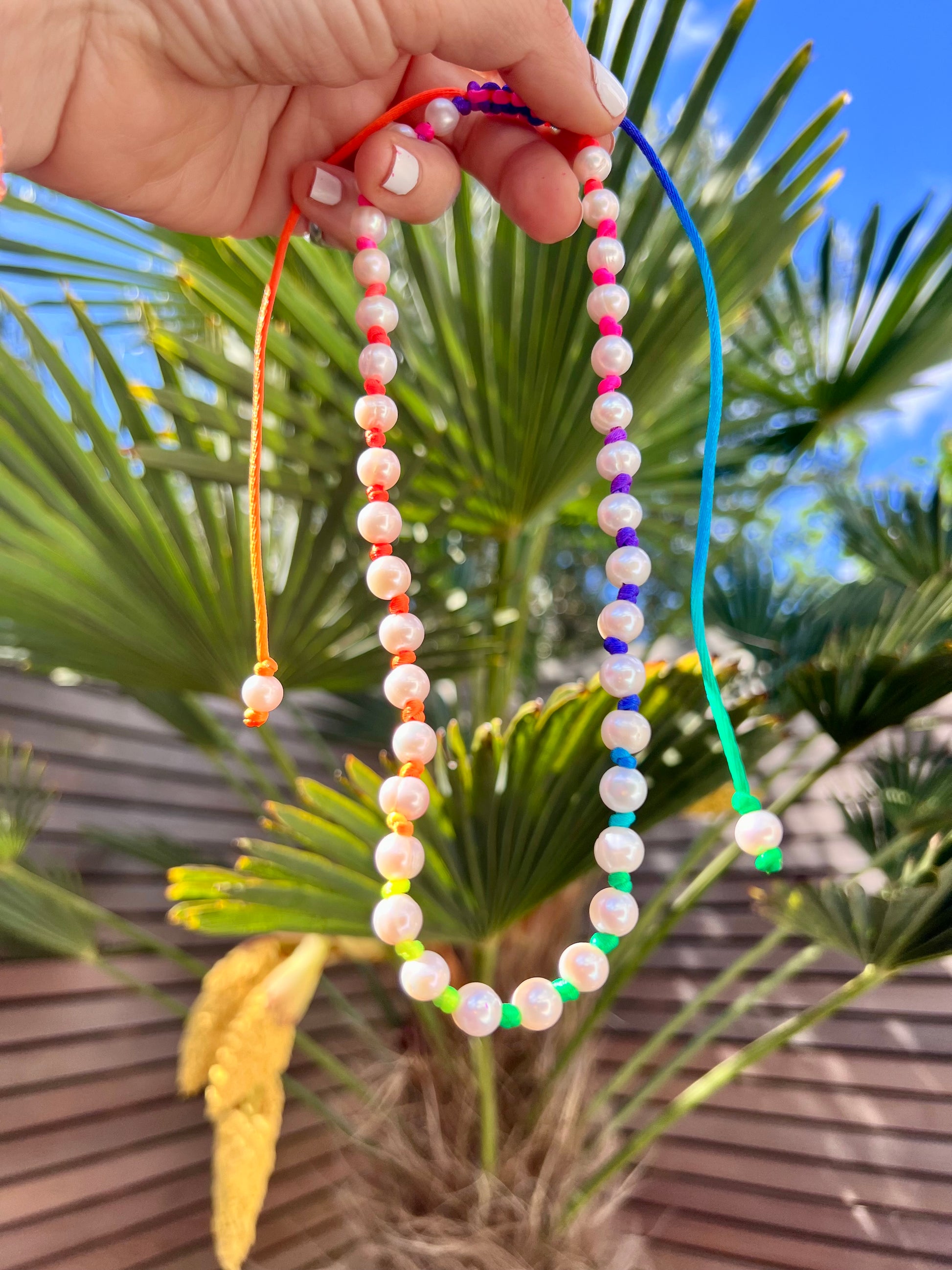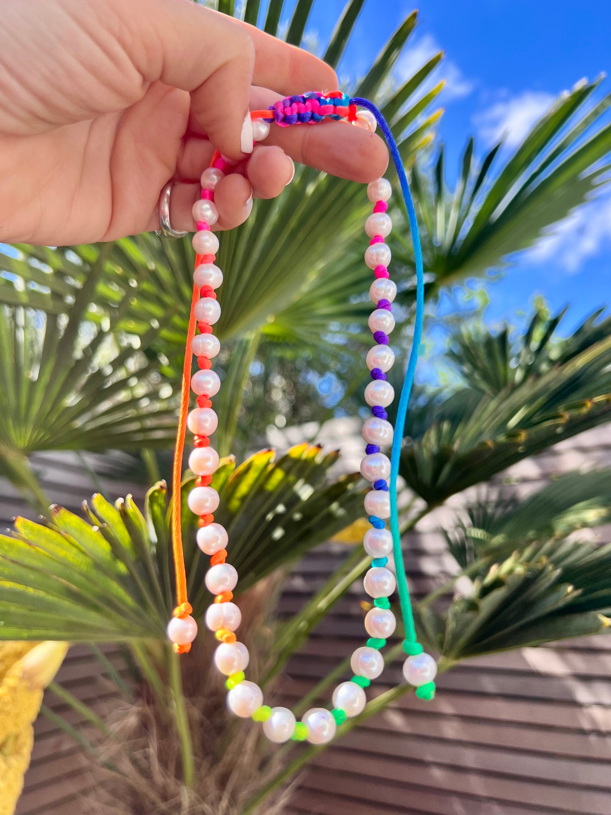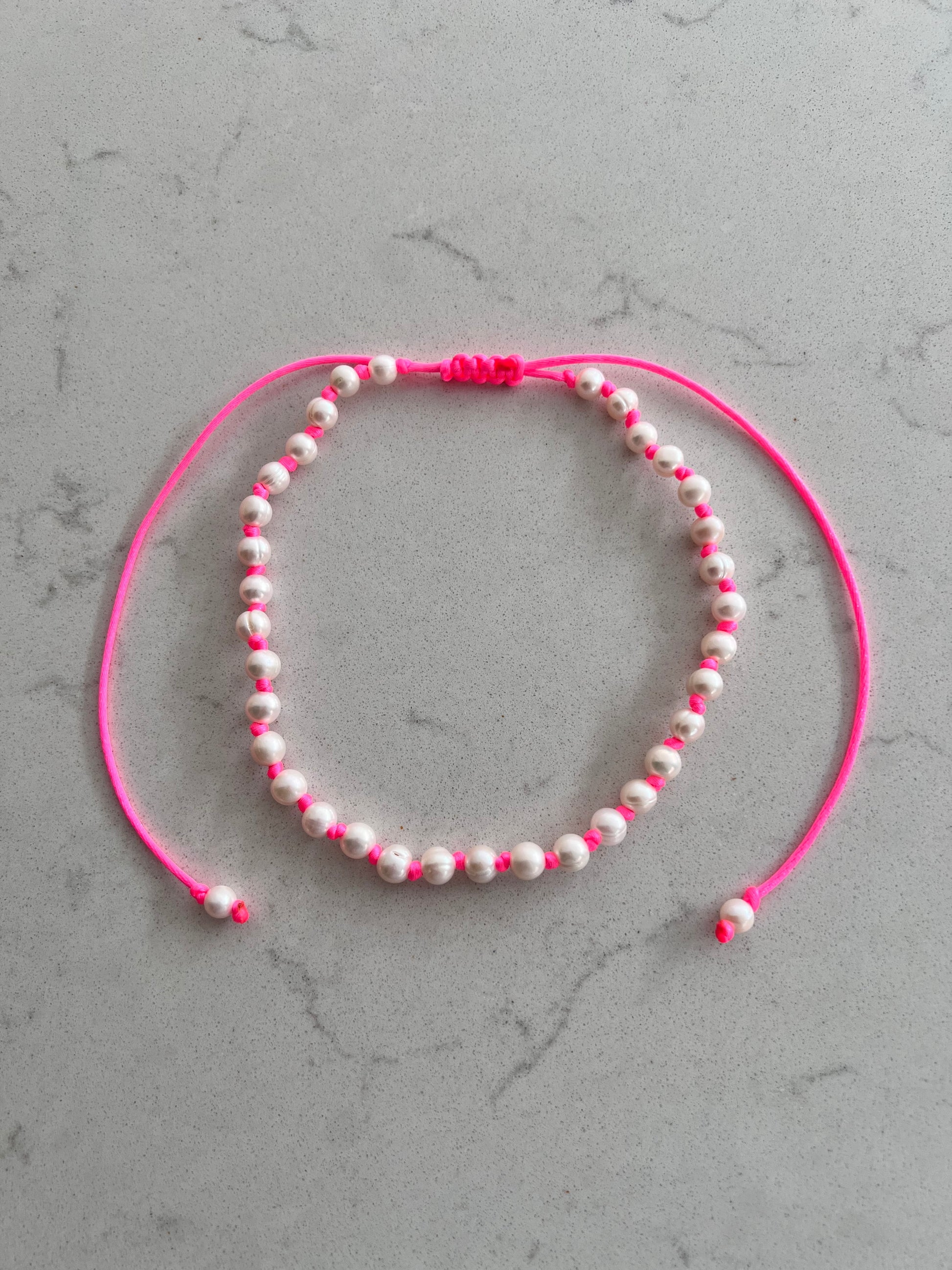 Made with beautiful quality freshwater pearls with neon cord hand knotted between every pearl.