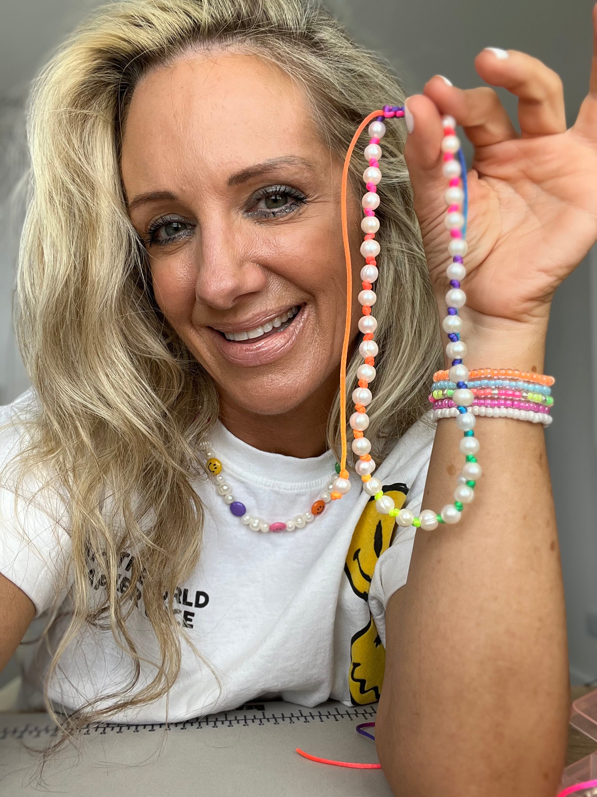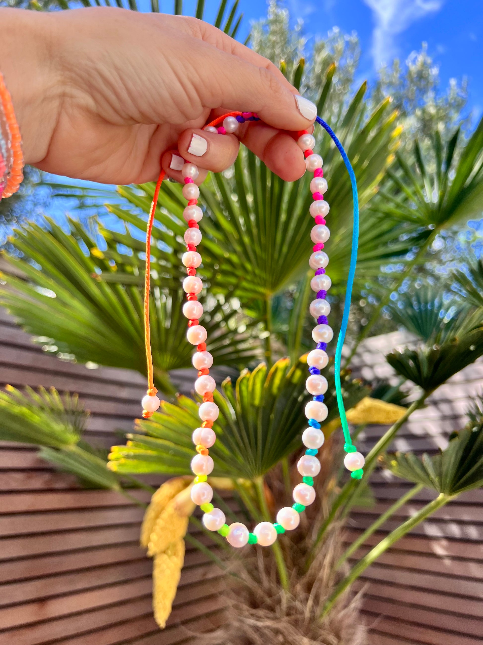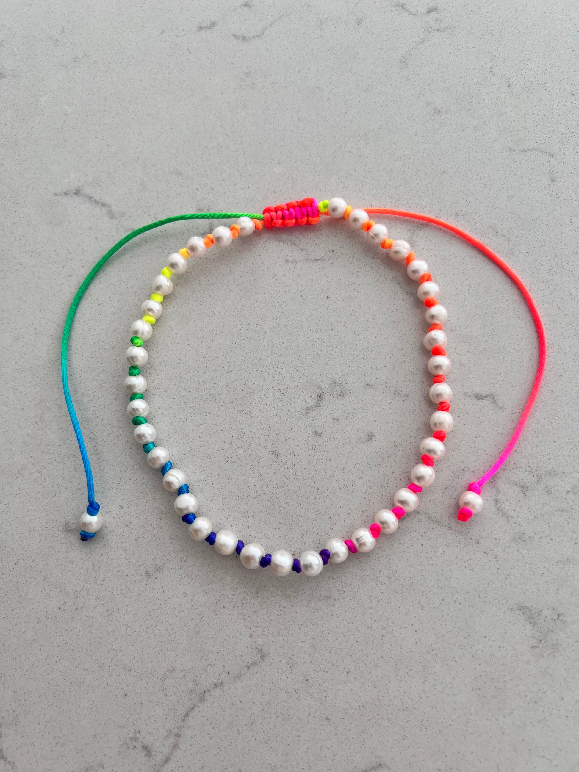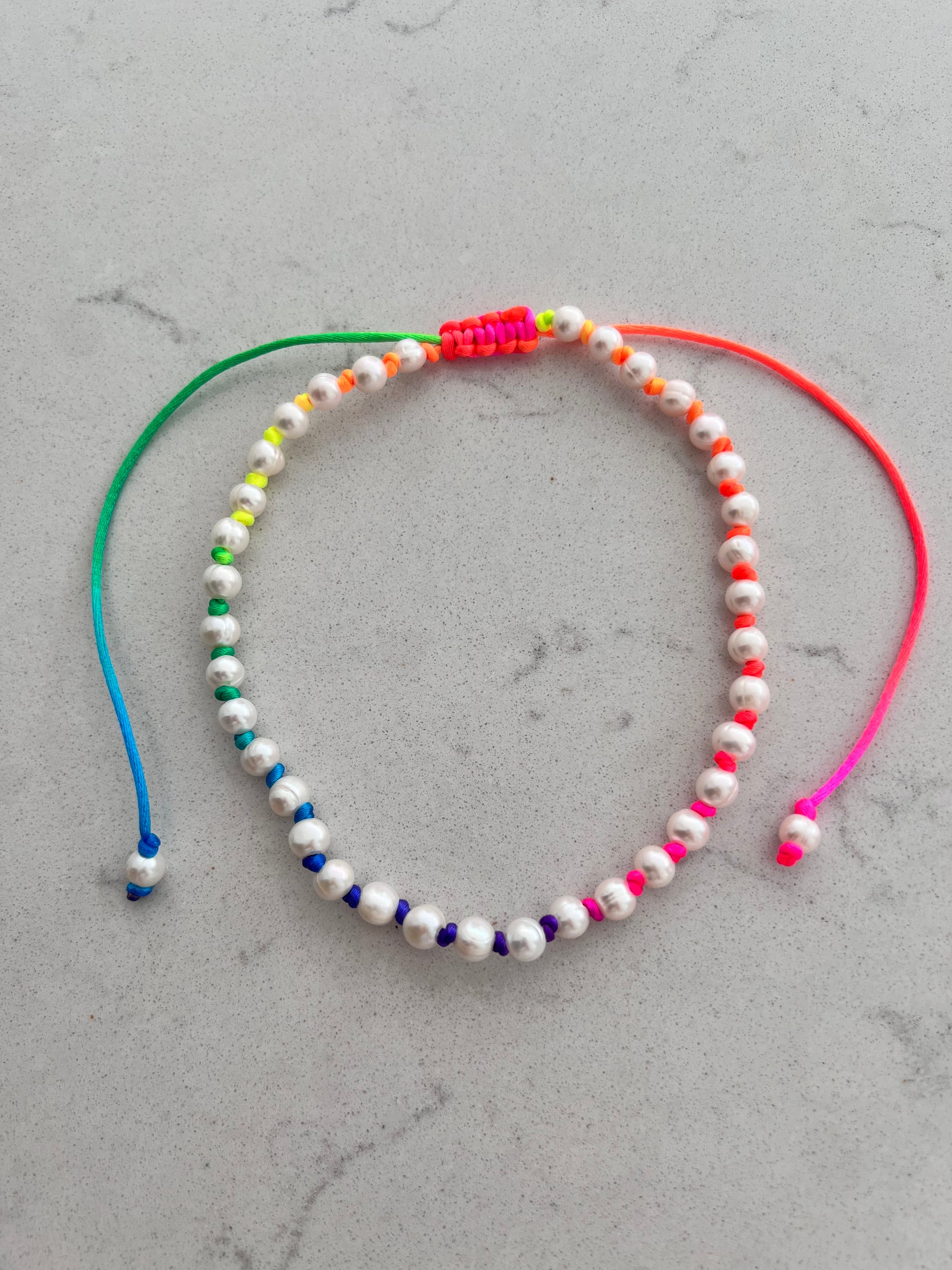 Made with beautiful quality freshwater pearls with neon cord hand knotted between every pearl.