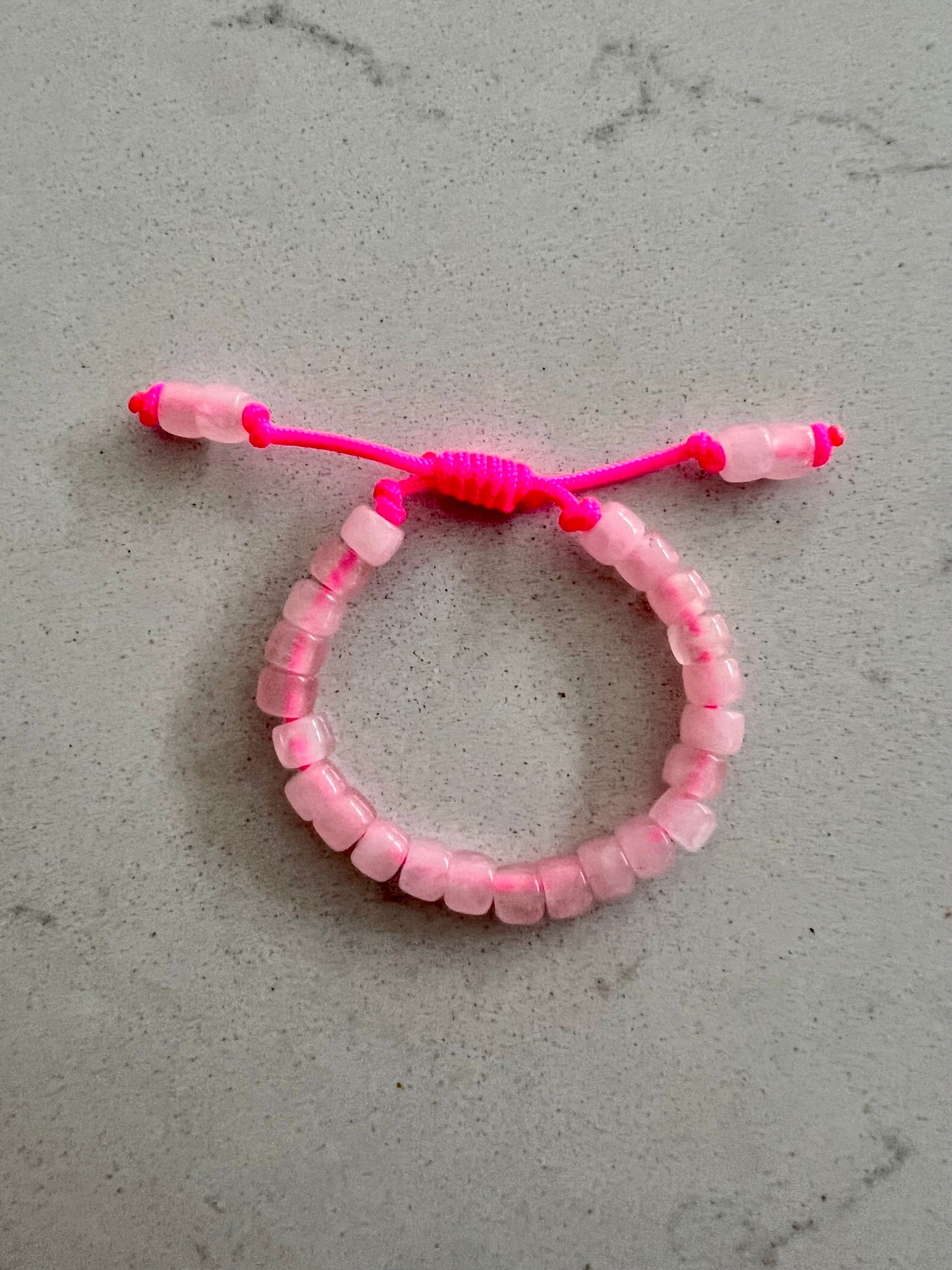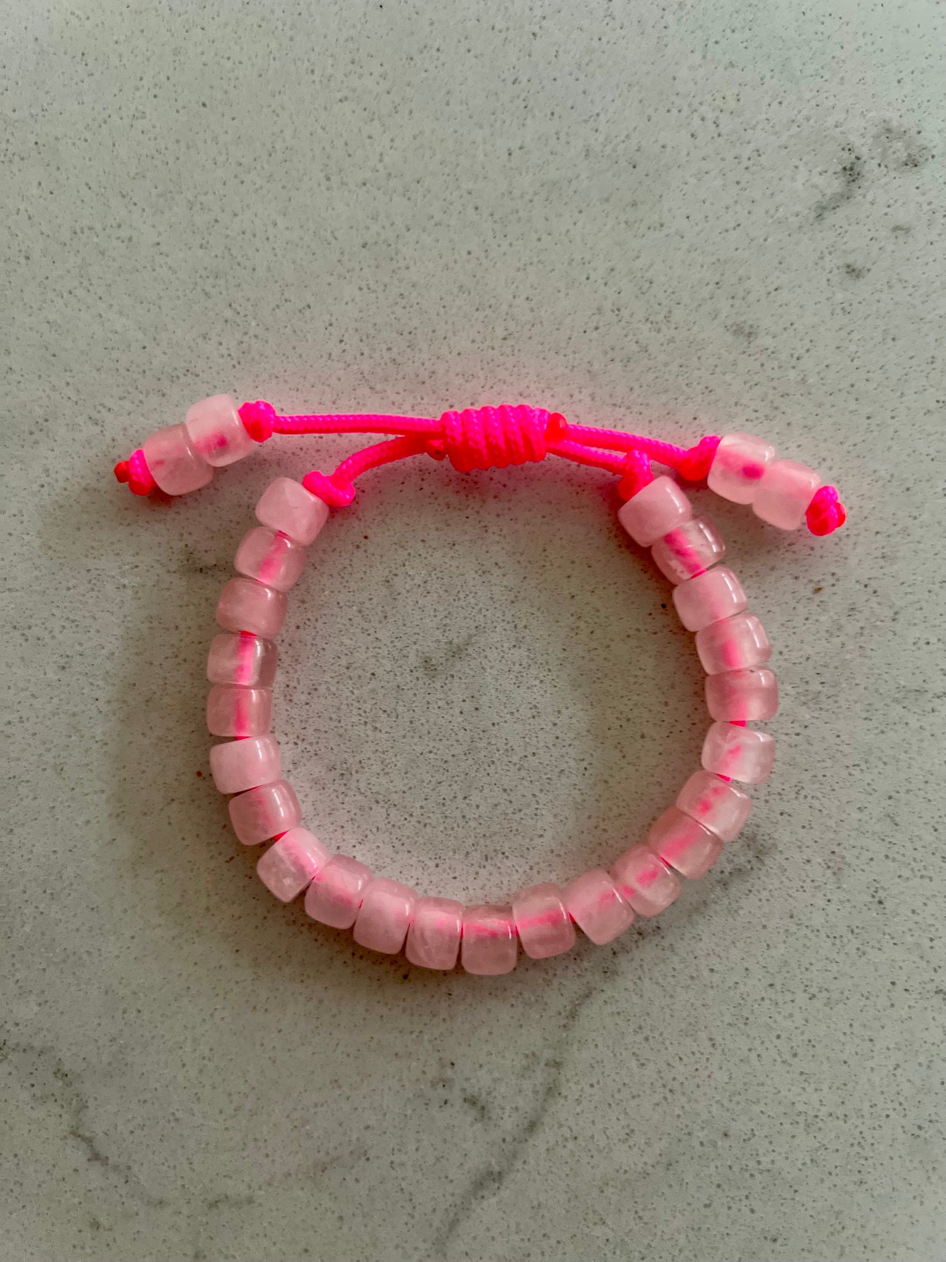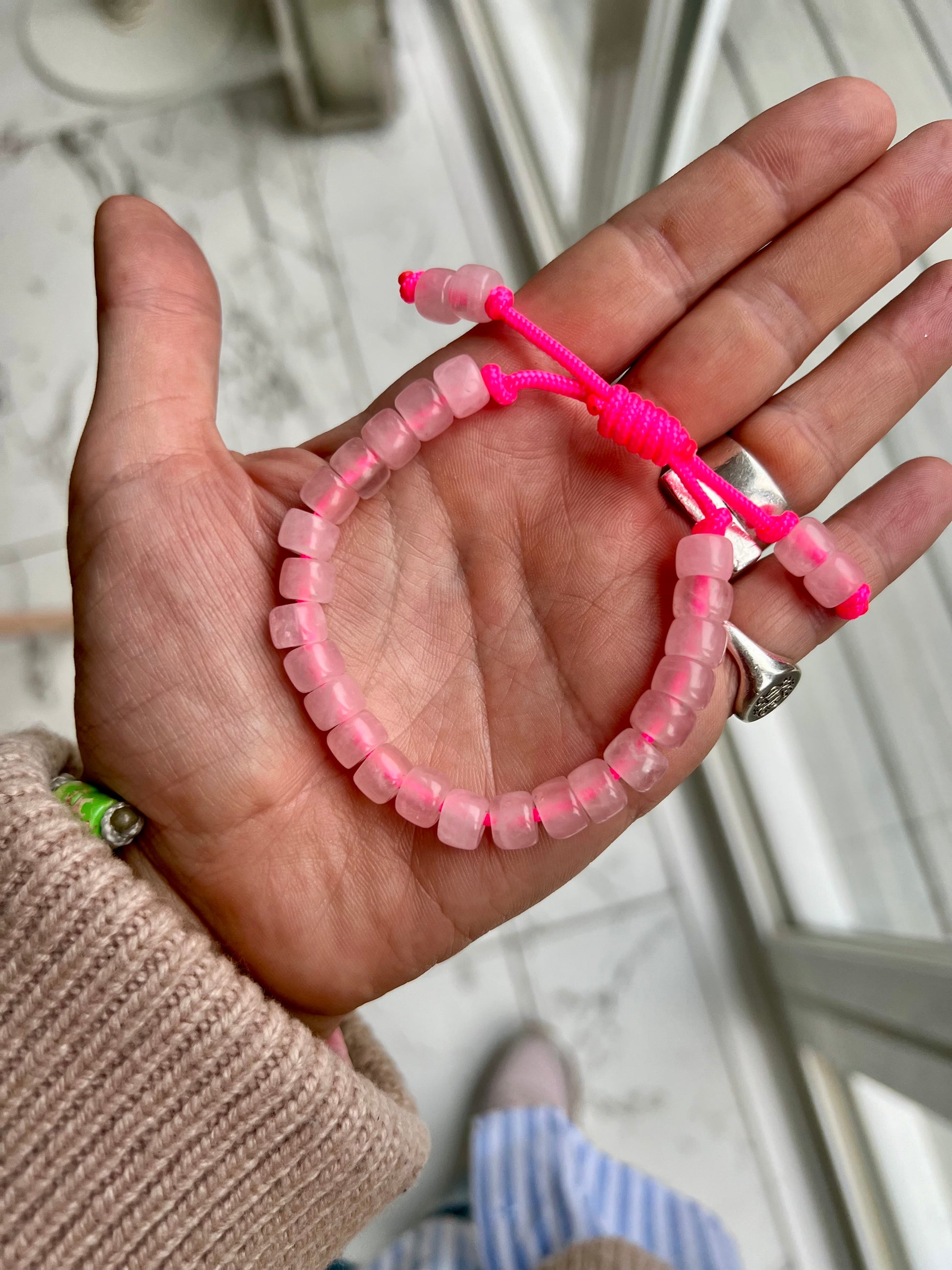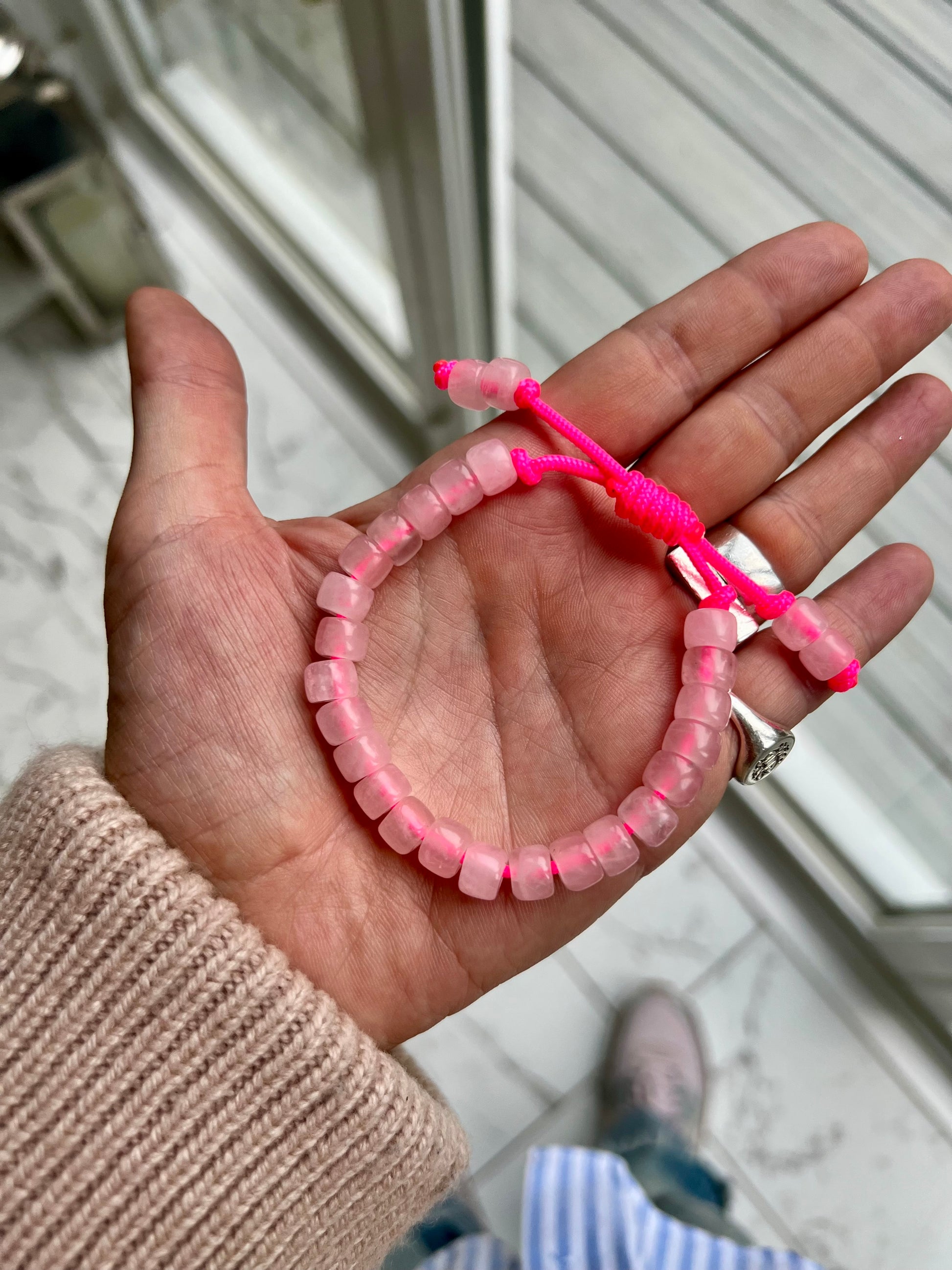 Made from Rose Quartz Gemstone, beaded onto a neon pink nylon cord and finished with a twisted sliding knot making it adjustable to you wrist 🤜🏻