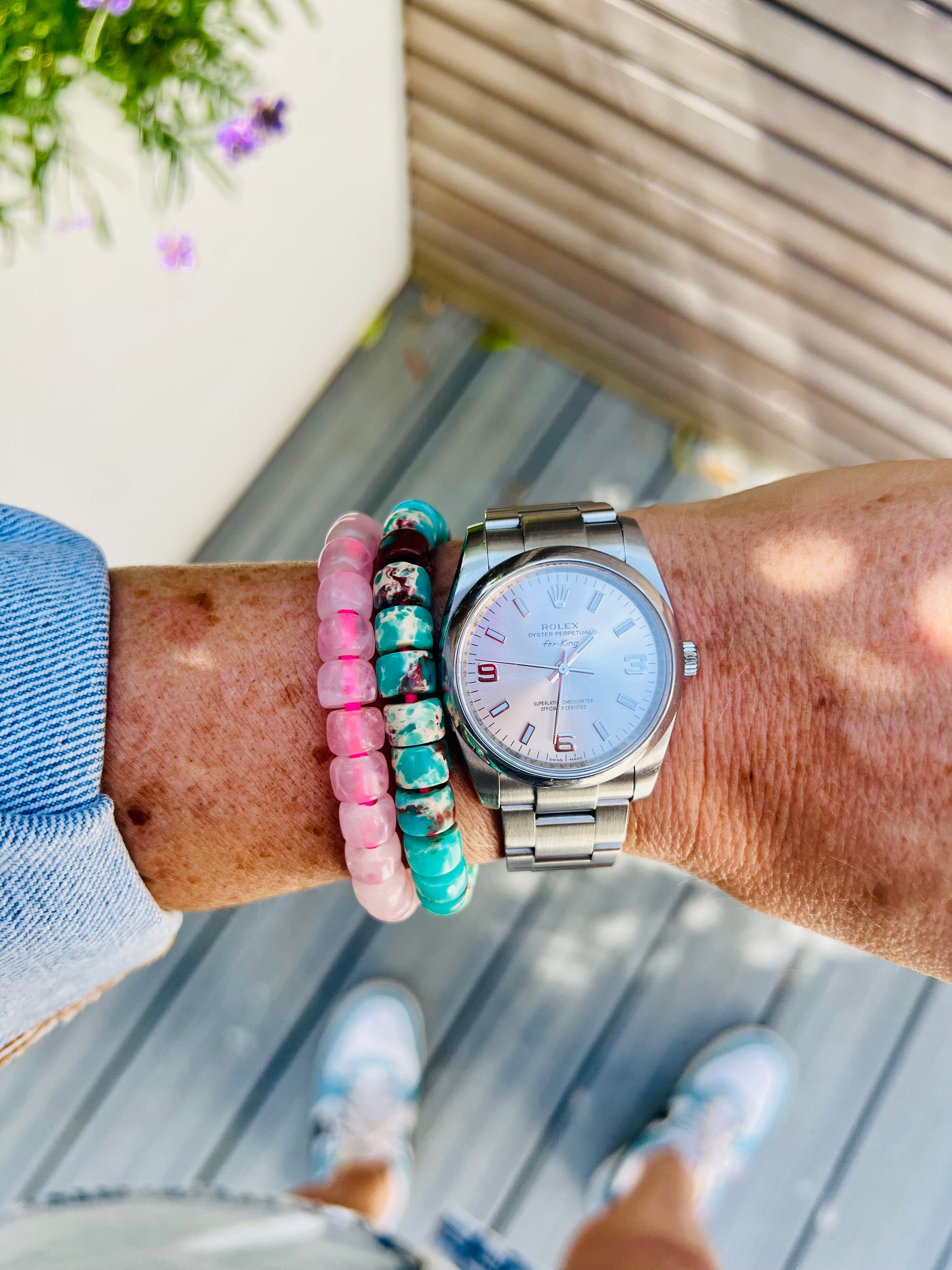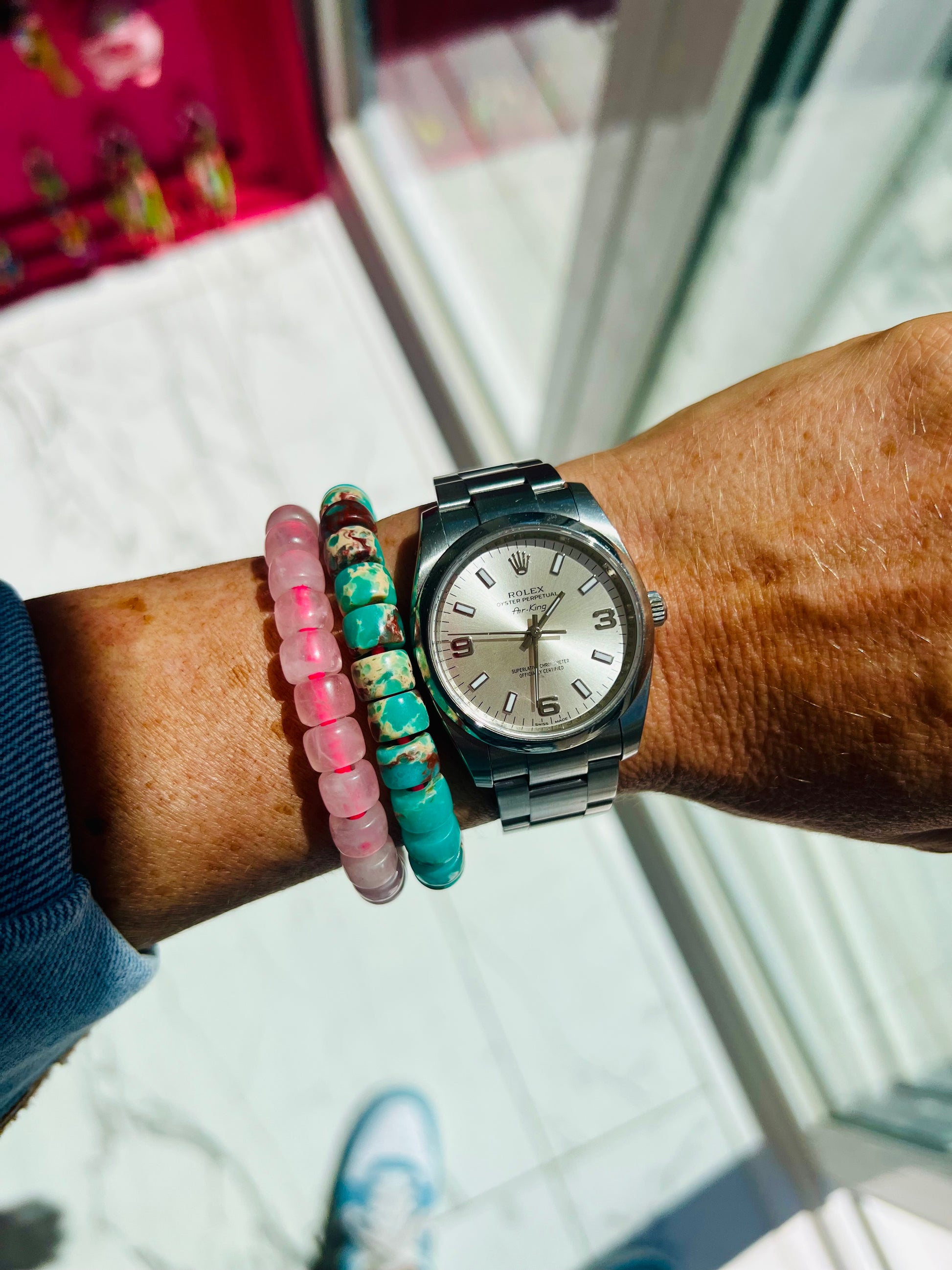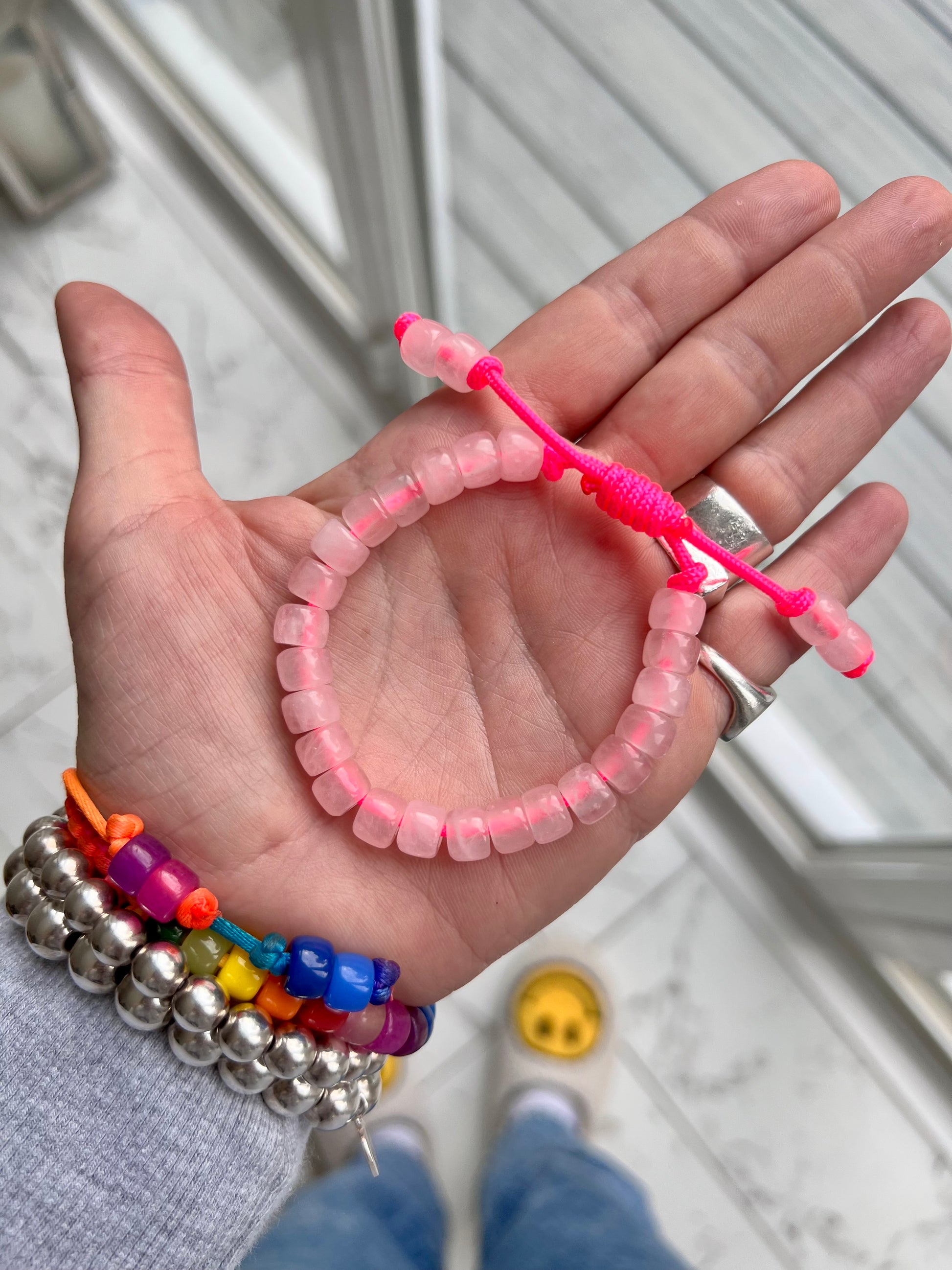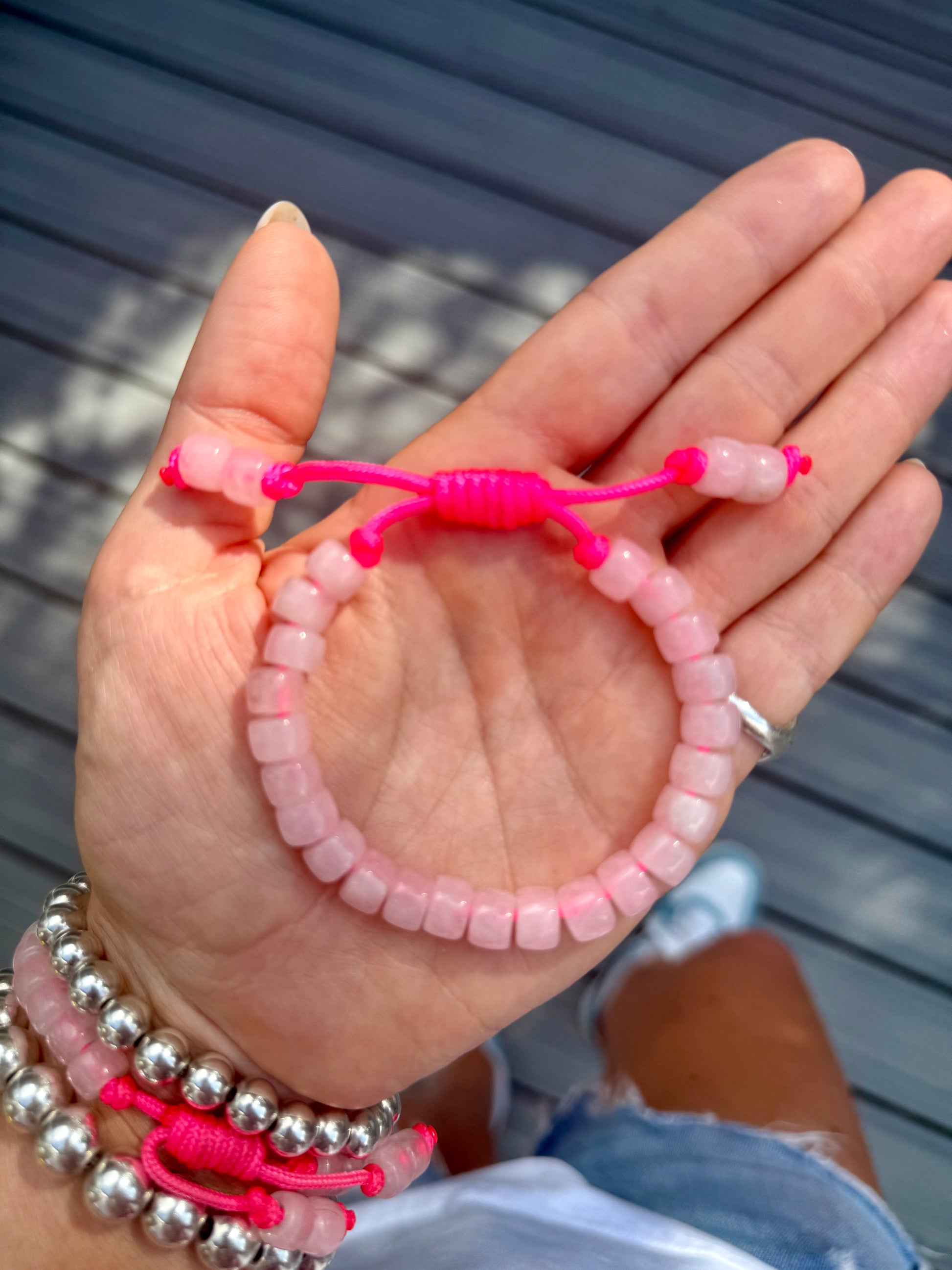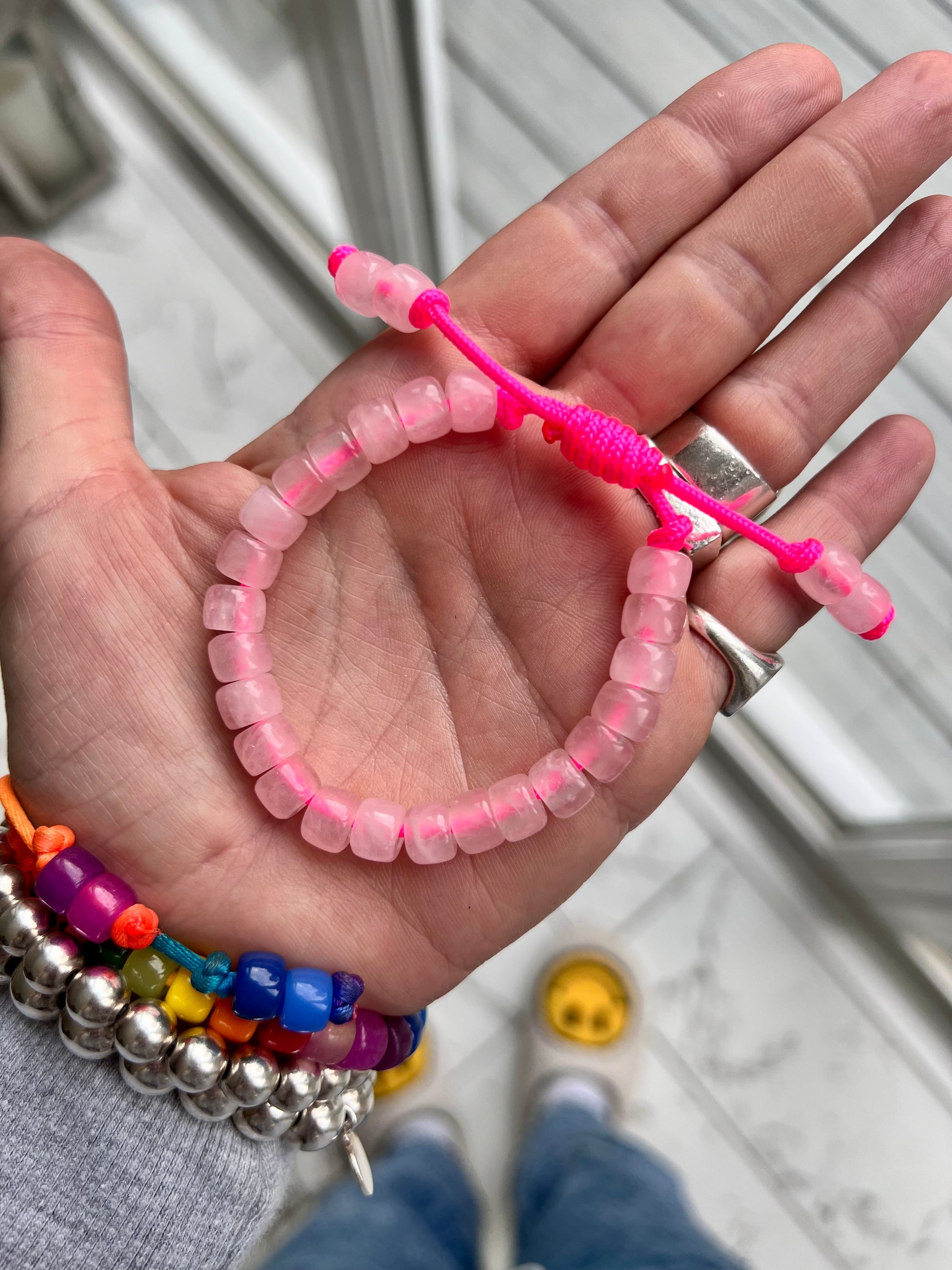 Made from Rose Quartz Gemstone, beaded onto a neon pink nylon cord and finished with a twisted sliding knot making it adjustable to you wrist 🤜🏻