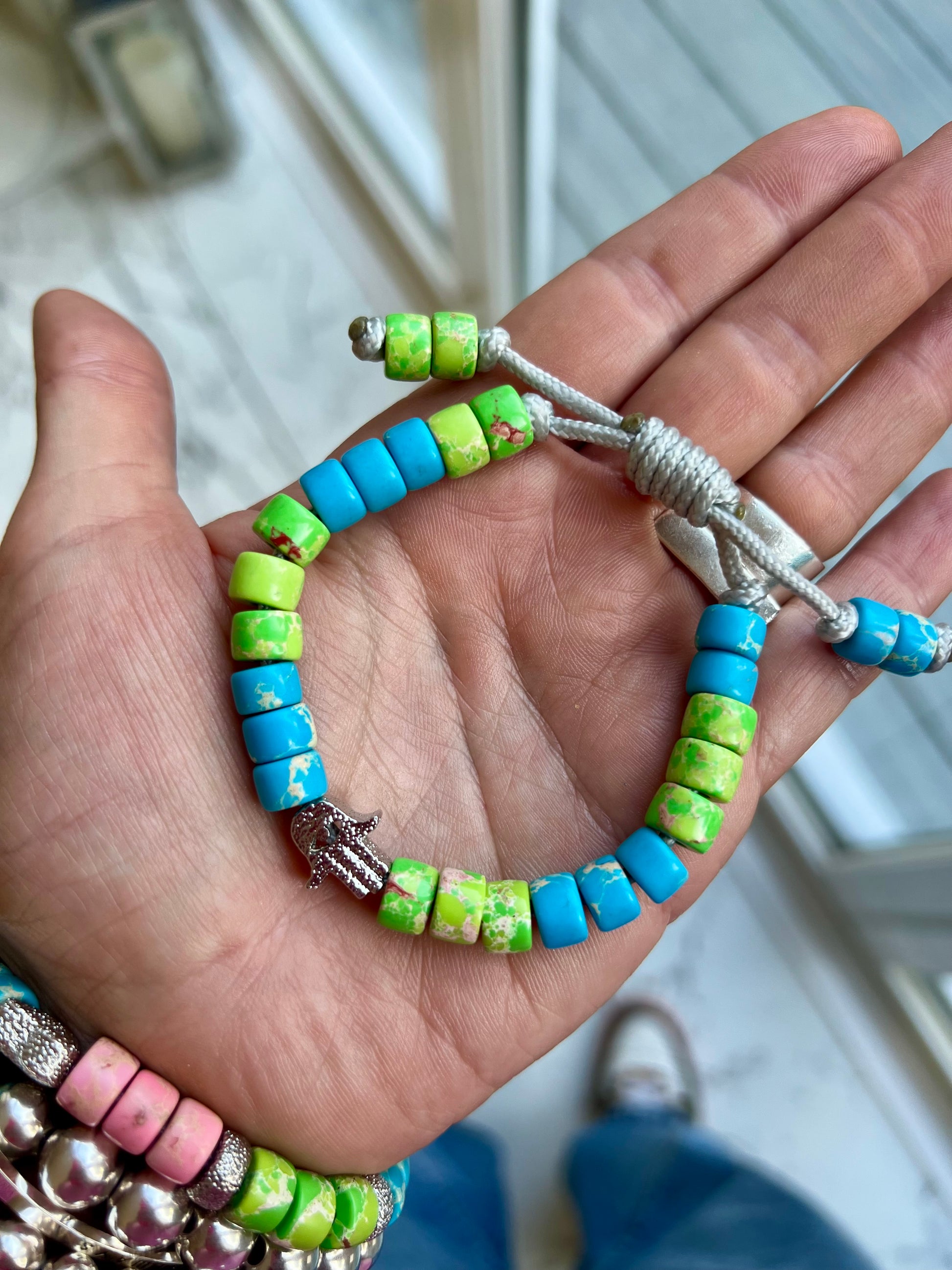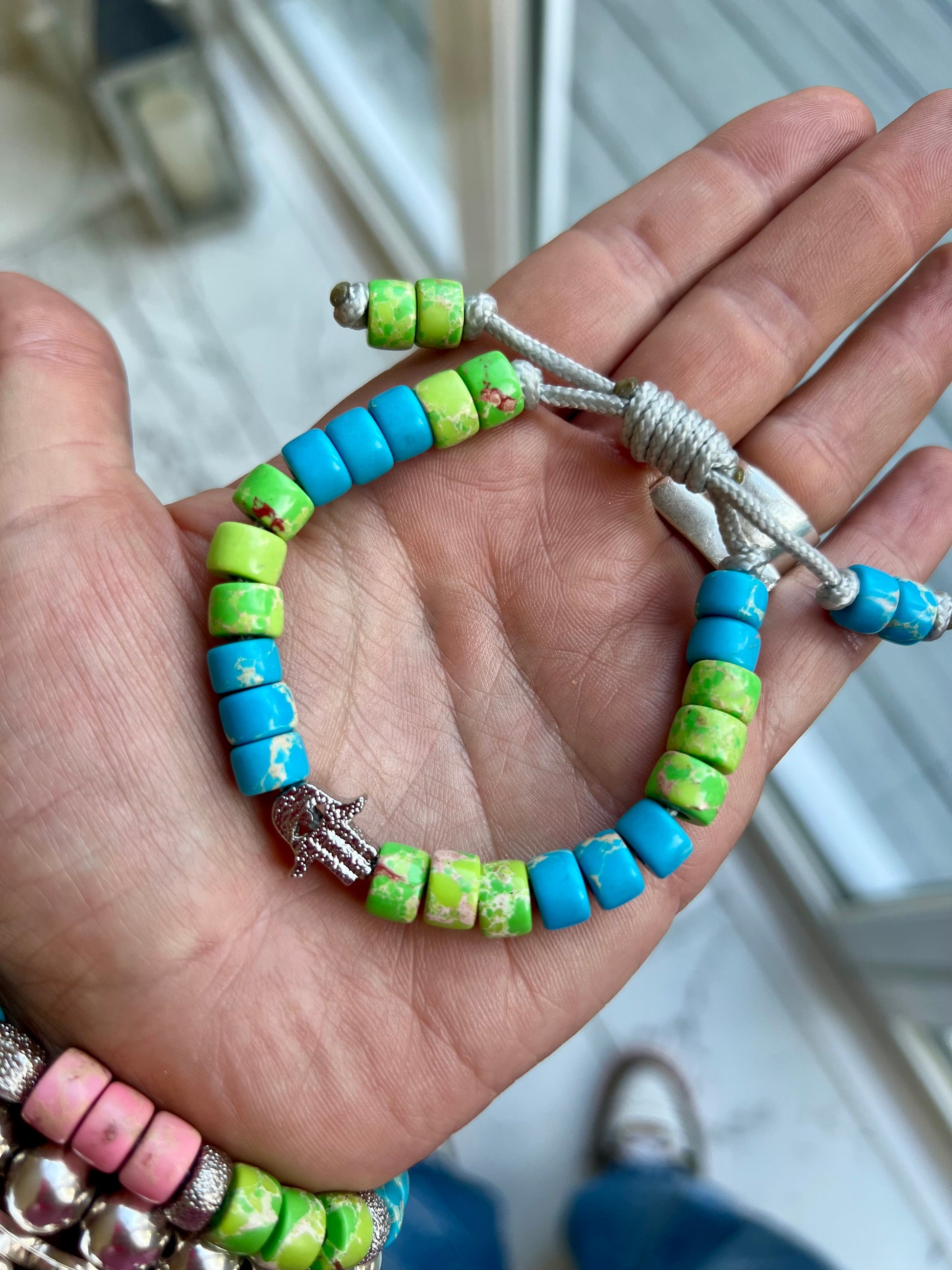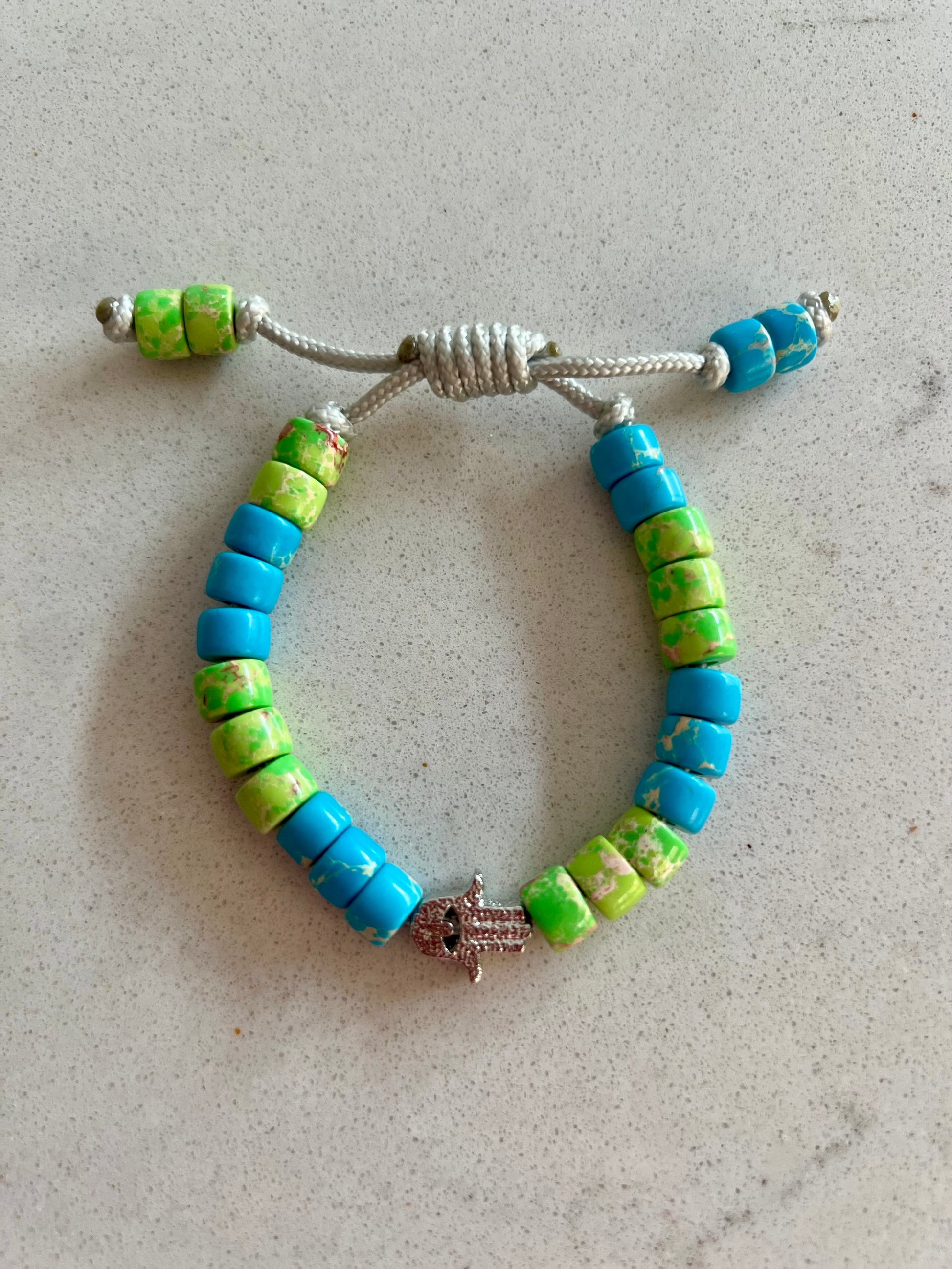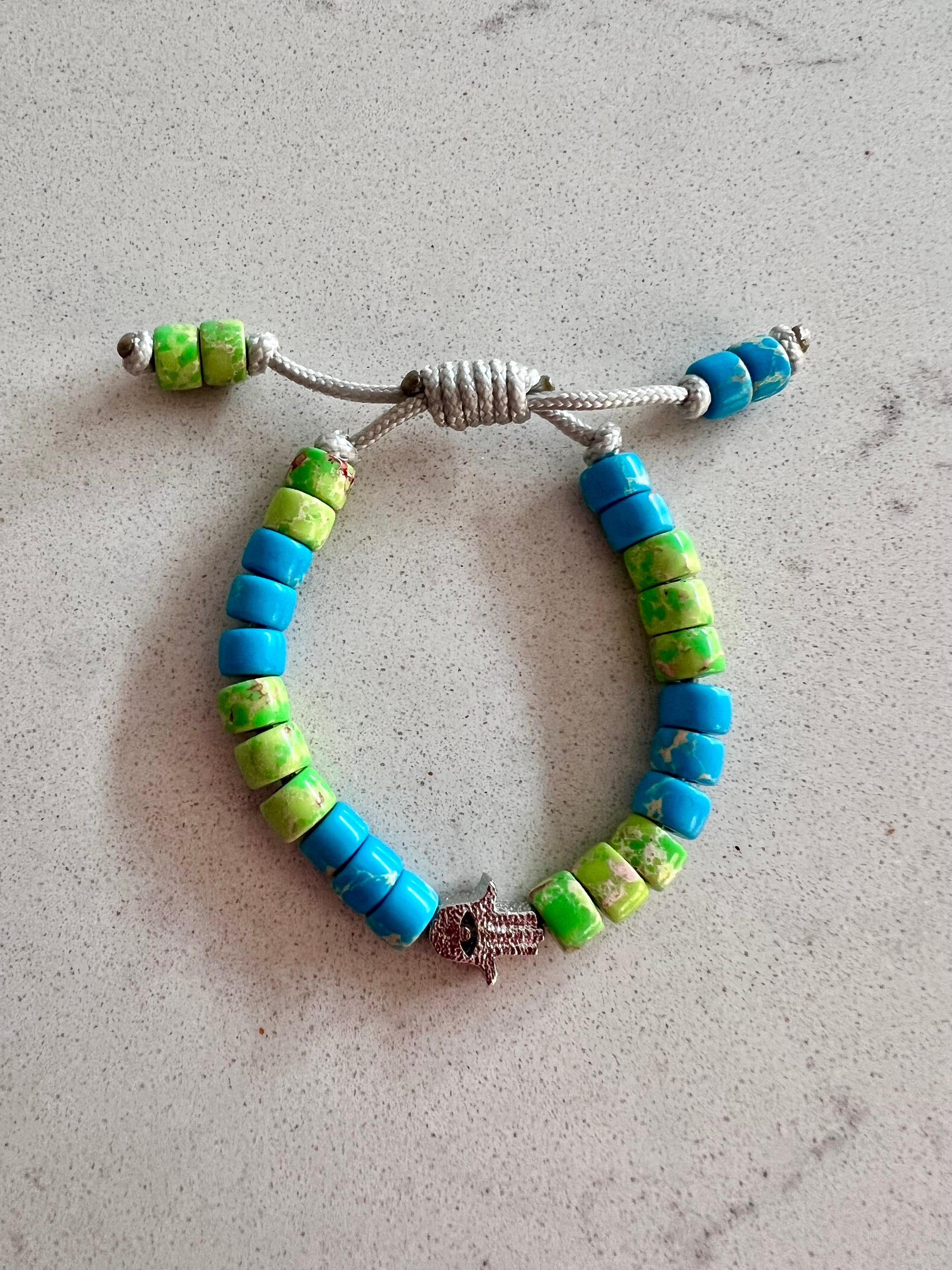 Made from Blue & Green Imperial Jasper Gemstone Beads, with a Silver Textured Hamsa Bead taking centre stage 💖