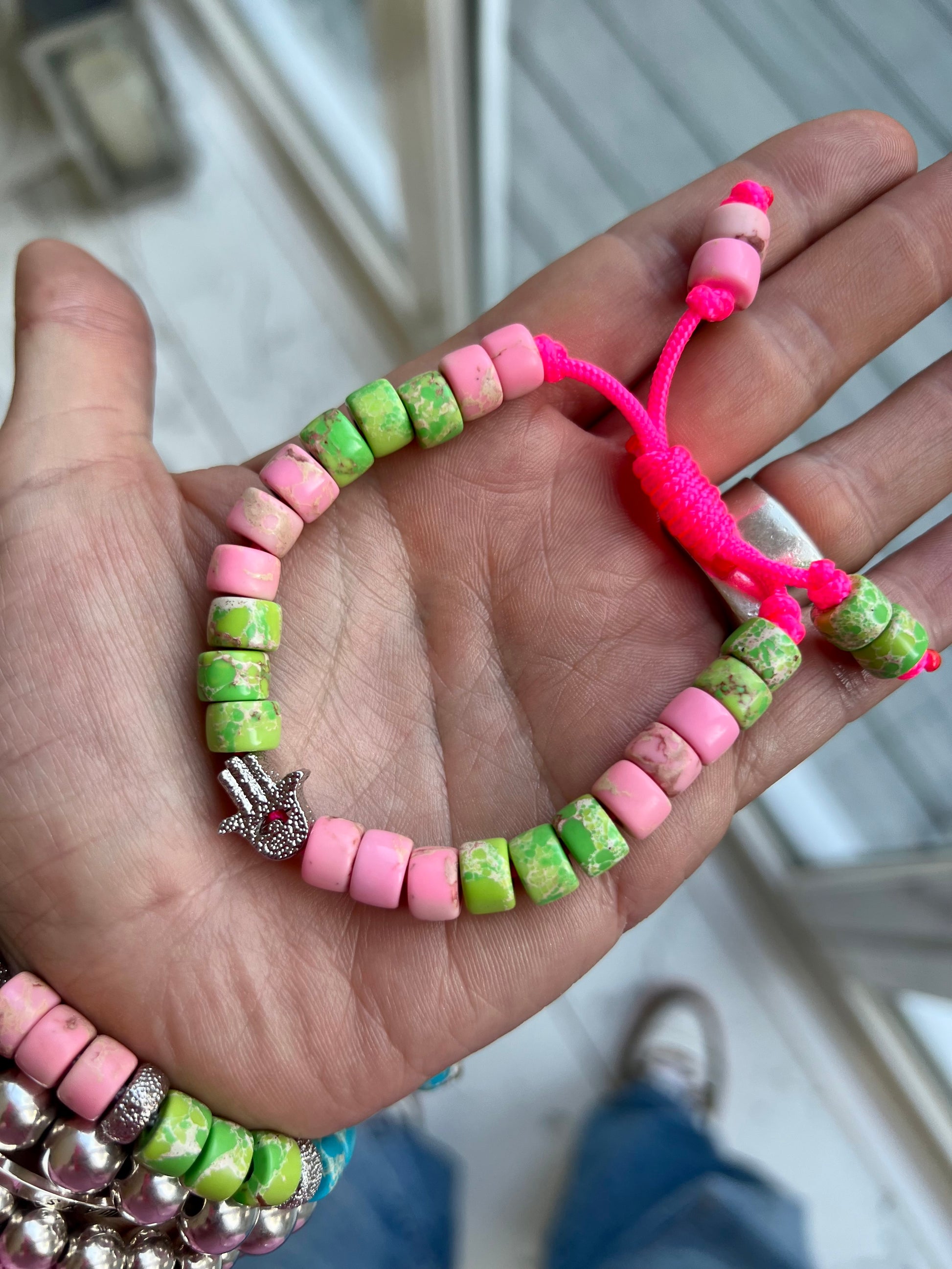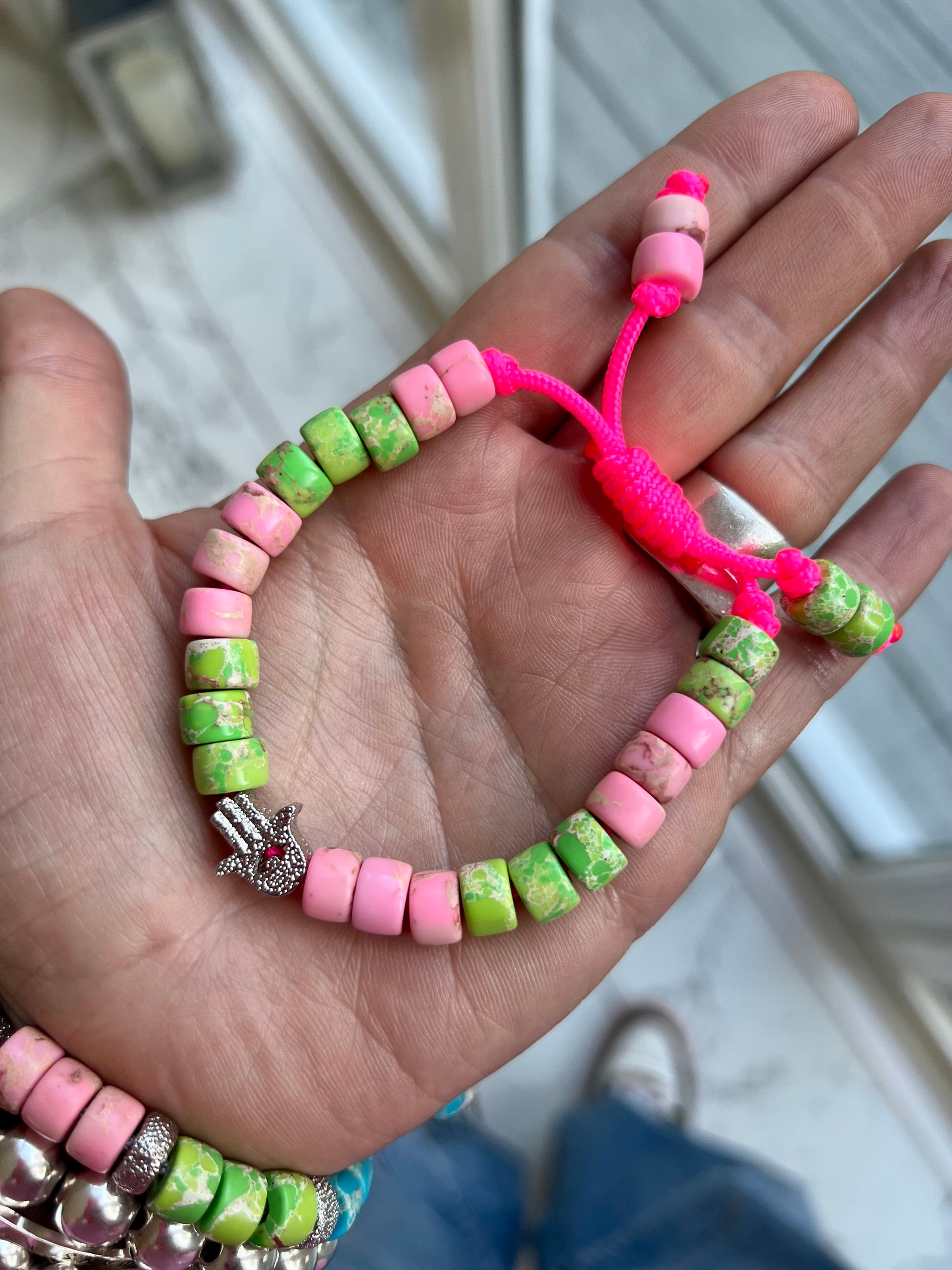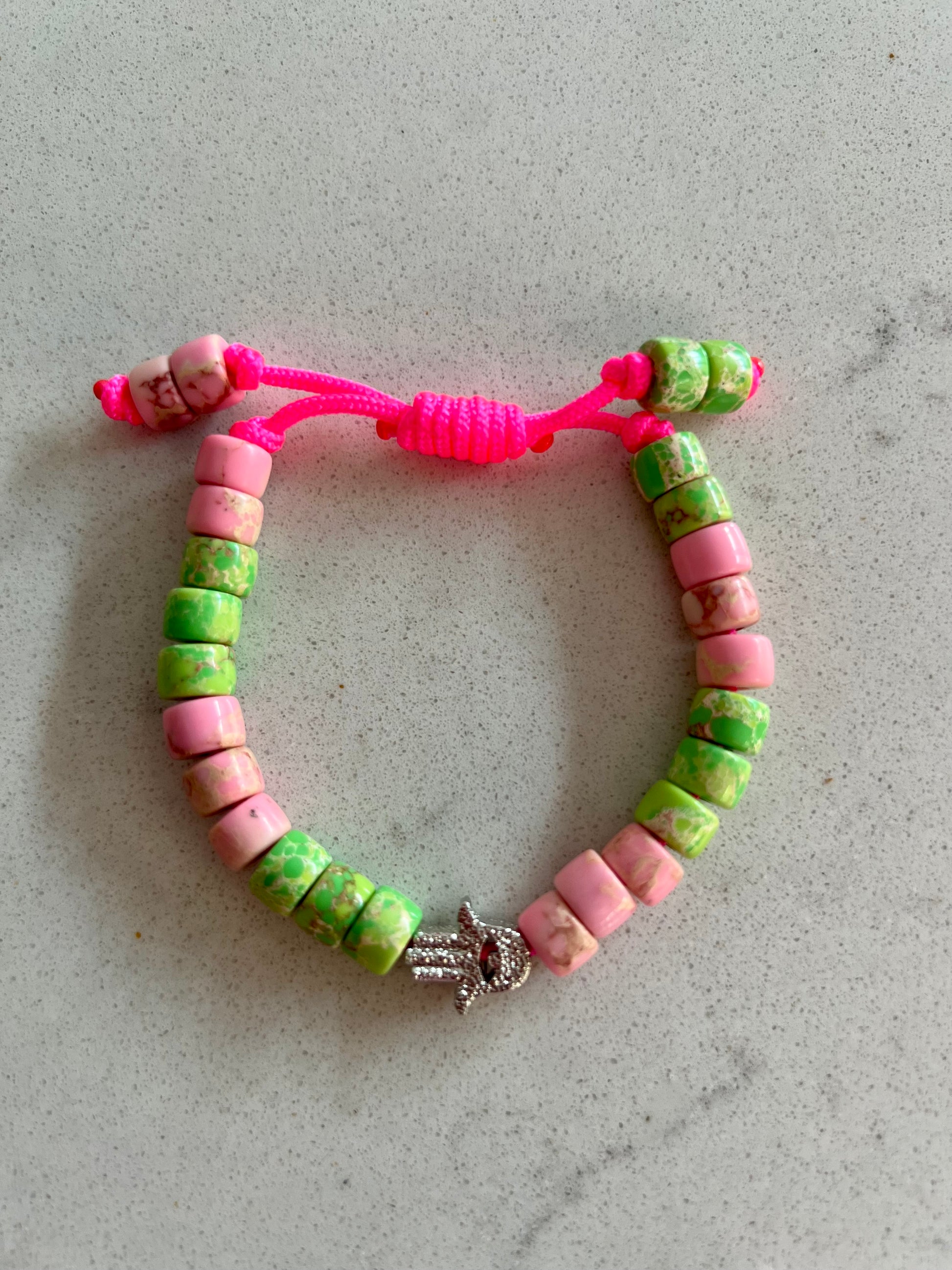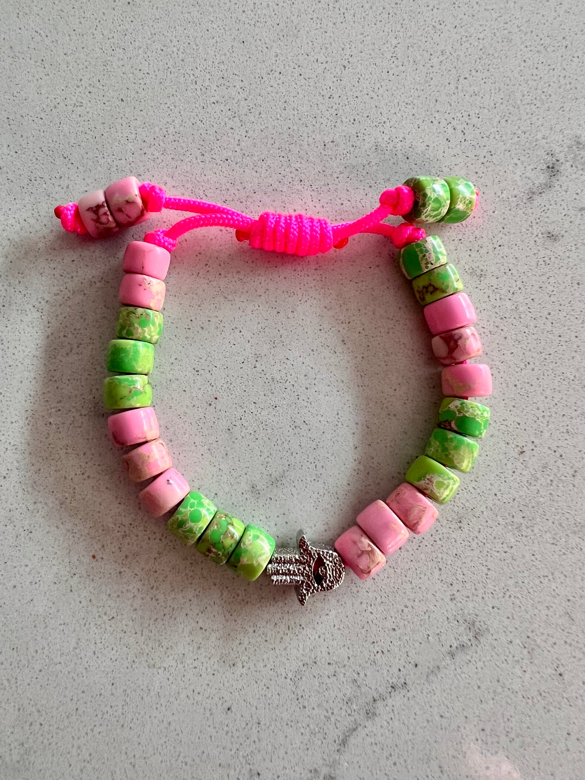 Beaded onto a neon pink nylon cord and finished with a twisted sliding knot making it adjustable to you wrist 🤜🏻