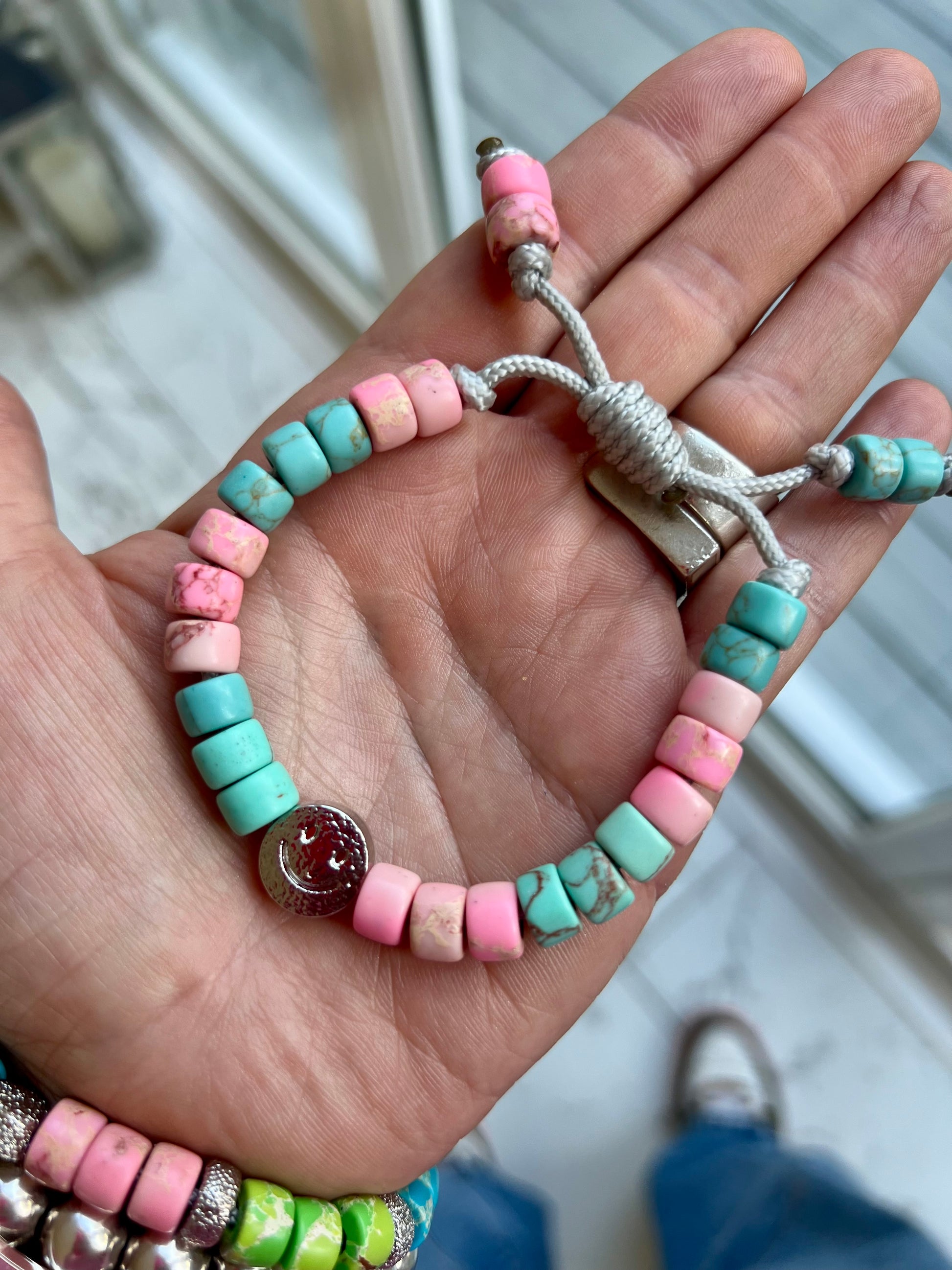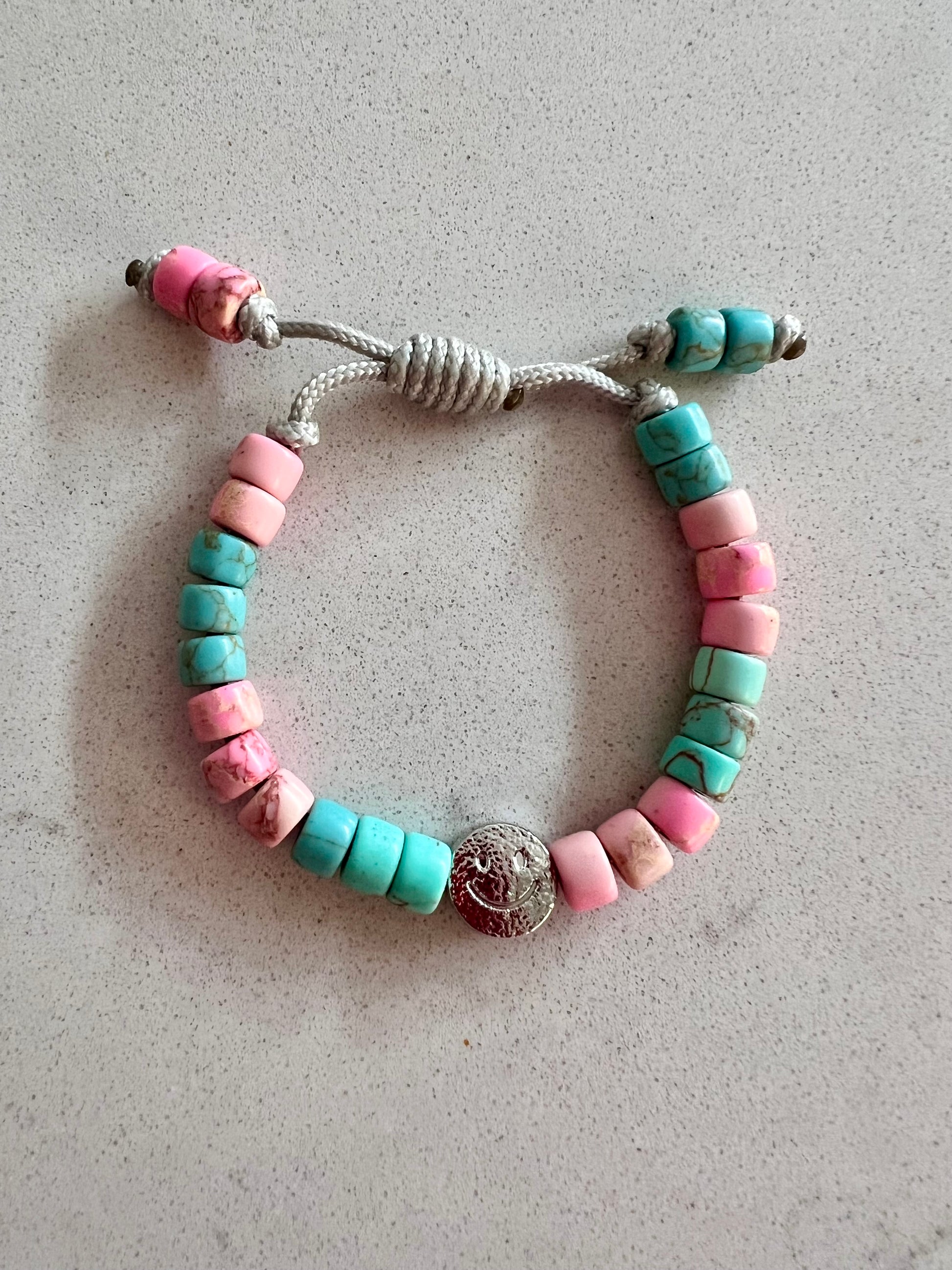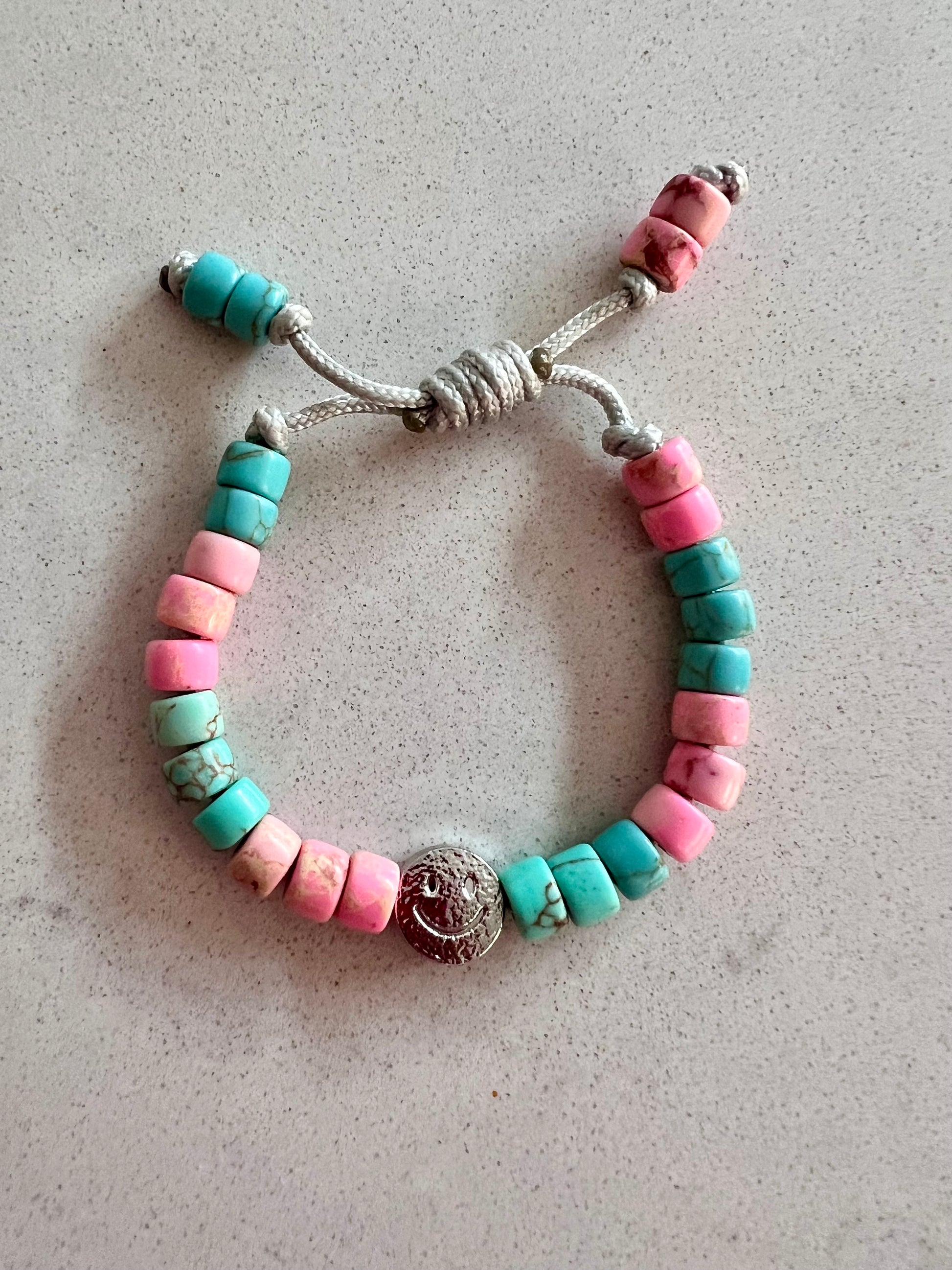 Made from Turquoise & Pink Imperial Jasper Gemstone Beads, with a Silver Textured Smiley Bead taking centre stage 💖