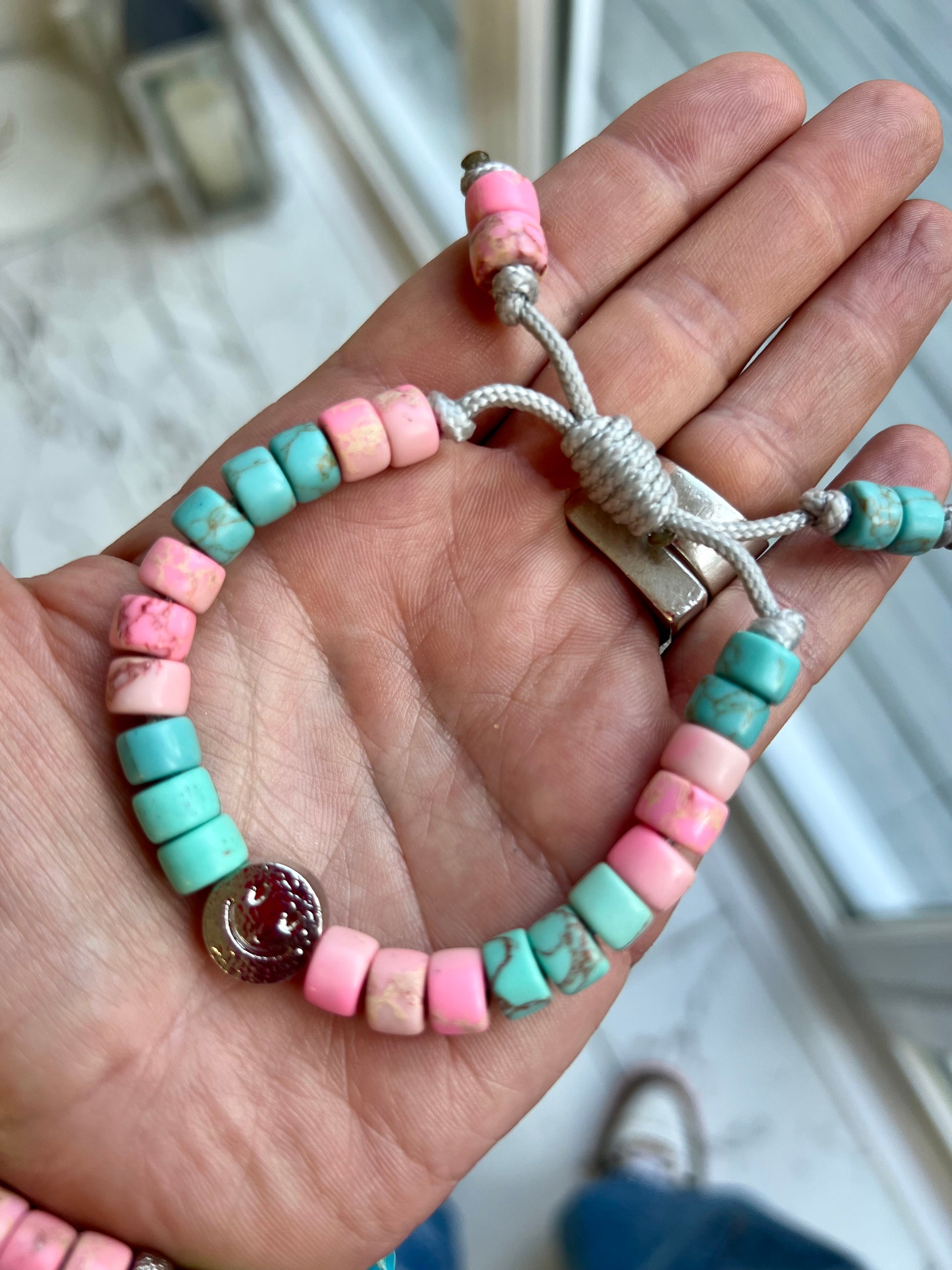 Beaded onto a silver nylon cord and finished with a twisted sliding knot making it adjustable to you wrist 🤜🏻