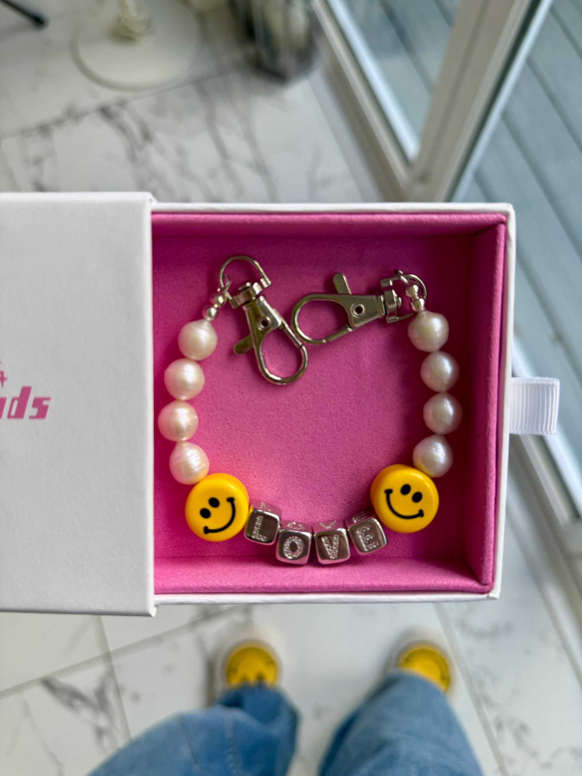 Handmade with lustrous freshwater pearls, sparkling silver-plated pavé LOVE letter beads, and glossy clay Smileys — this charm is where playful energy meets elegance.